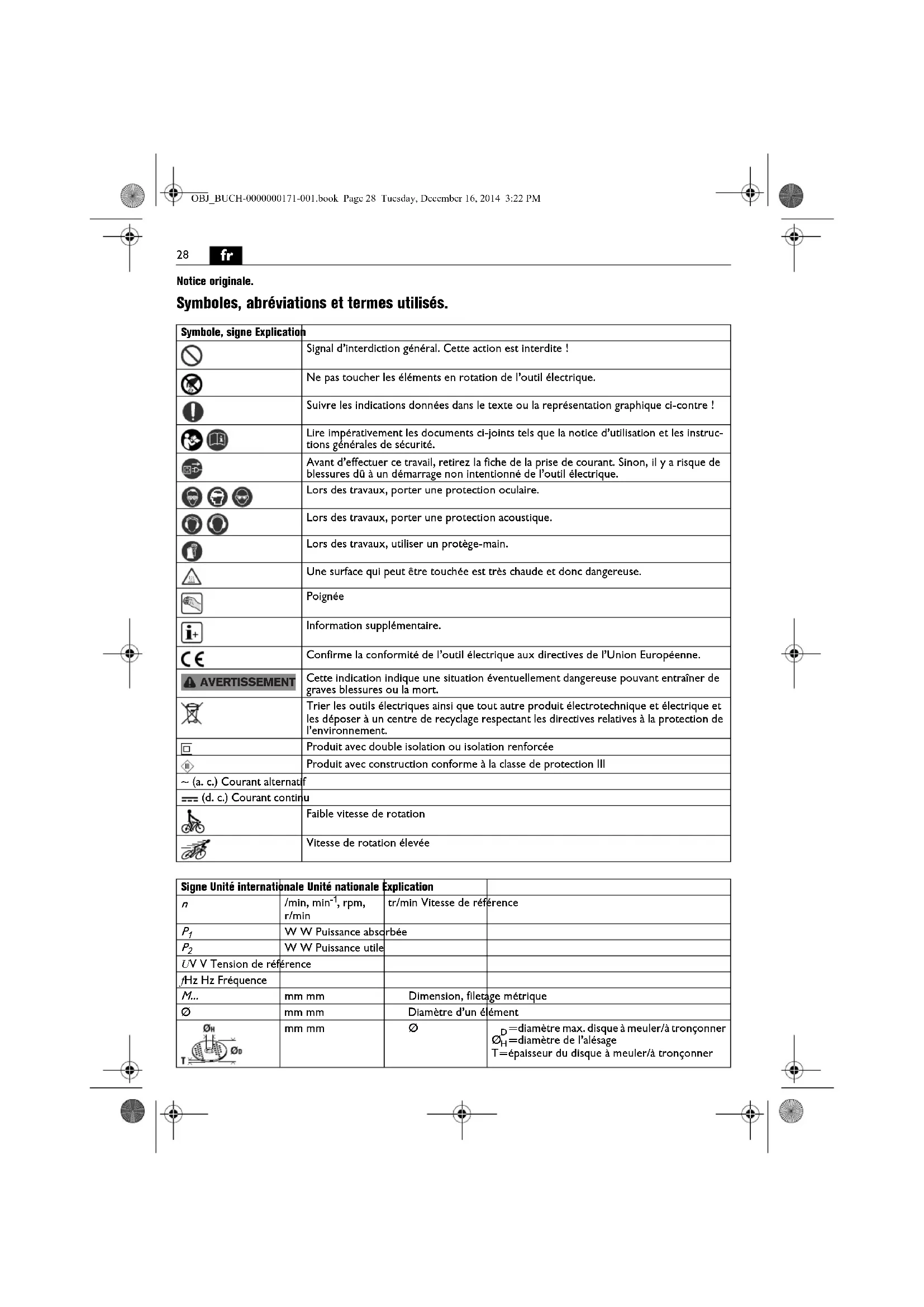 Notice originale. Symboles, abréviations et termes utilisés. Symbole, signe Explication Signal d’interdiction général. Cette action est interdite ! Ne pas toucher les éléments en rotation de l’outil électrique. Suivre les indications données dans le texte ou la représentation graphique ci-contre ! Lire impérativement les documents ci-joints tels que la notice d’utilisation et les instruc- tions générales de sécurité. Avant d’effectuer ce travail, retirez la fiche de la prise de courant. Sinon, il y a risque de blessures dû à un démarrage non intentionné de l’outil électrique. Lors des travaux, porter une protection oculaire. Lors des travaux, porter une protection acoustique. Lors des travaux, utiliser un protège-main. Une surface qui peut être touchée est très chaude et donc dangereuse. Poignée Information supplémentaire. Confirme la conformité de l’outil électrique aux directives de l’Union Européenne. Cette indication indique une situation éventuellement dangereuse pouvant entraîner de graves blessures ou la mort. Trier les outils électriques ainsi que tout autre produit électrotechnique et électrique et les déposer à un centre de recyclage respectant les directives relatives à la protection de l’environnement. Produit avec double isolation ou isolation renforcée Produit avec construction conforme à la classe de protection III ~ (a. c.) Courant alternatif (d. c.) Courant continu Faible vitesse de rotation Vitesse de rotation élevée AVERTISSEMENT Signe Unité internationale Unité nationale Explication
