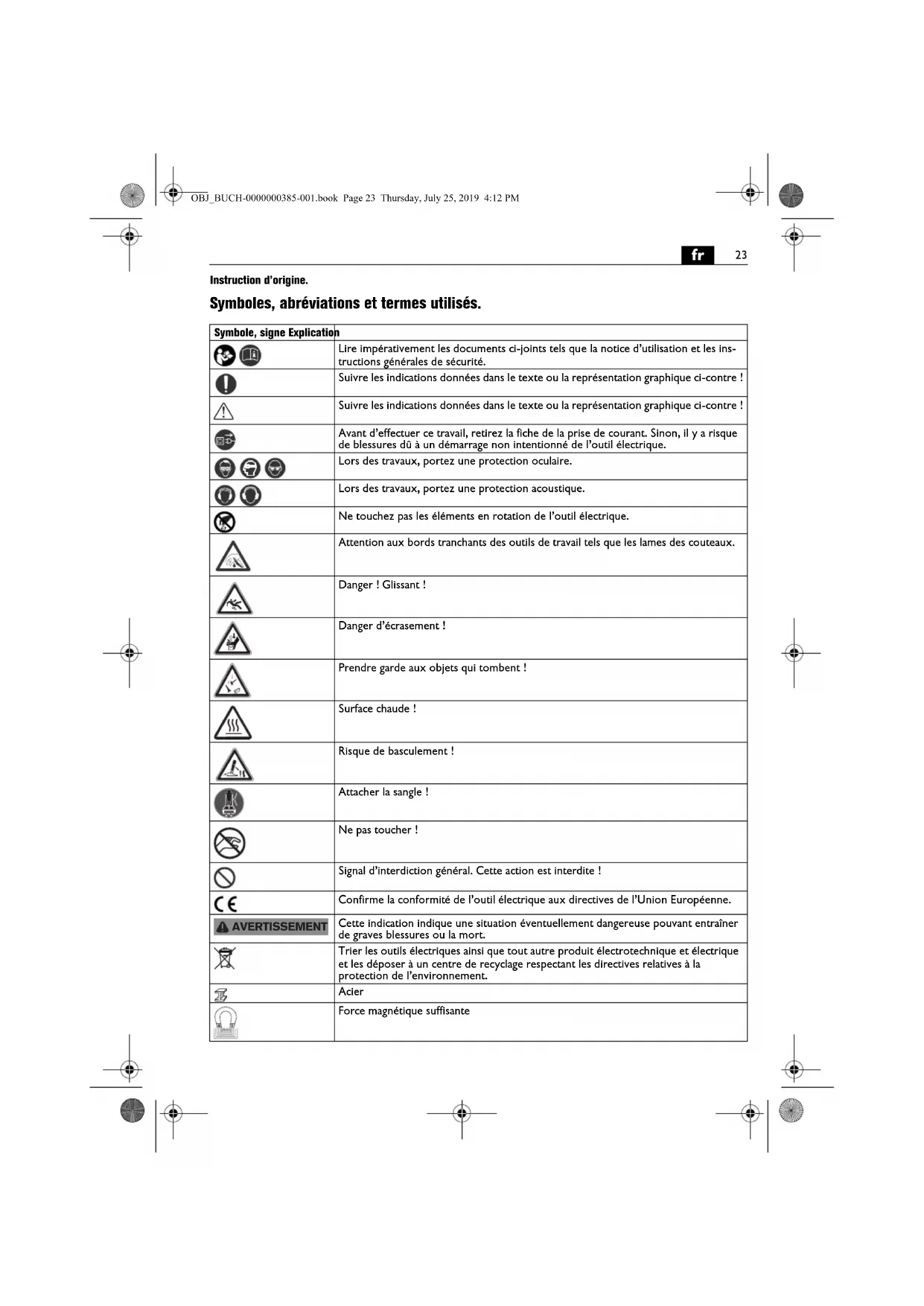 Instruction d’origine. Symboles, abréviations et termes utilisés. Symbole, signe Explication Lire impérativement les documents ci-joints tels que la notice d’utilisation et les ins- tructions générales de sécurité. Suivre les indications données dans le texte ou la représentation graphique ci-contre ! Suivre les indications données dans le texte ou la représentation graphique ci-contre ! Avant d’effectuer ce travail, retirez la fiche de la prise de courant. Sinon, il y a risque de blessures dû à un démarrage non intentionné de l’outil électrique. Lors des travaux, portez une protection oculaire. Lors des travaux, portez une protection acoustique. Ne touchez pas les éléments en rotation de l’outil électrique. Attention aux bords tranchants des outils de travail tels que les lames des couteaux. Danger ! Glissant ! Danger d’écrasement ! Prendre garde aux objets qui tombent ! Surface chaude ! Risque de basculement ! Attacher la sangle ! Ne pas toucher ! Signal d’interdiction général. Cette action est interdite ! Confirme la conformité de l’outil électrique aux directives de l’Union Européenne. Cette indication indique une situation éventuellement dangereuse pouvant entraîner de graves blessures ou la mort. Trier les outils électriques ainsi que tout autre produit électrotechnique et électrique et les déposer à un centre de recyclage respectant les directives relatives à la protection de l’environnement. Acier Force magnétique suffisante AVERTISSEMENT OBJ_BUCH-0000000385-001.book Page 23 Thursday, July 25, 2019 4:12 PM24