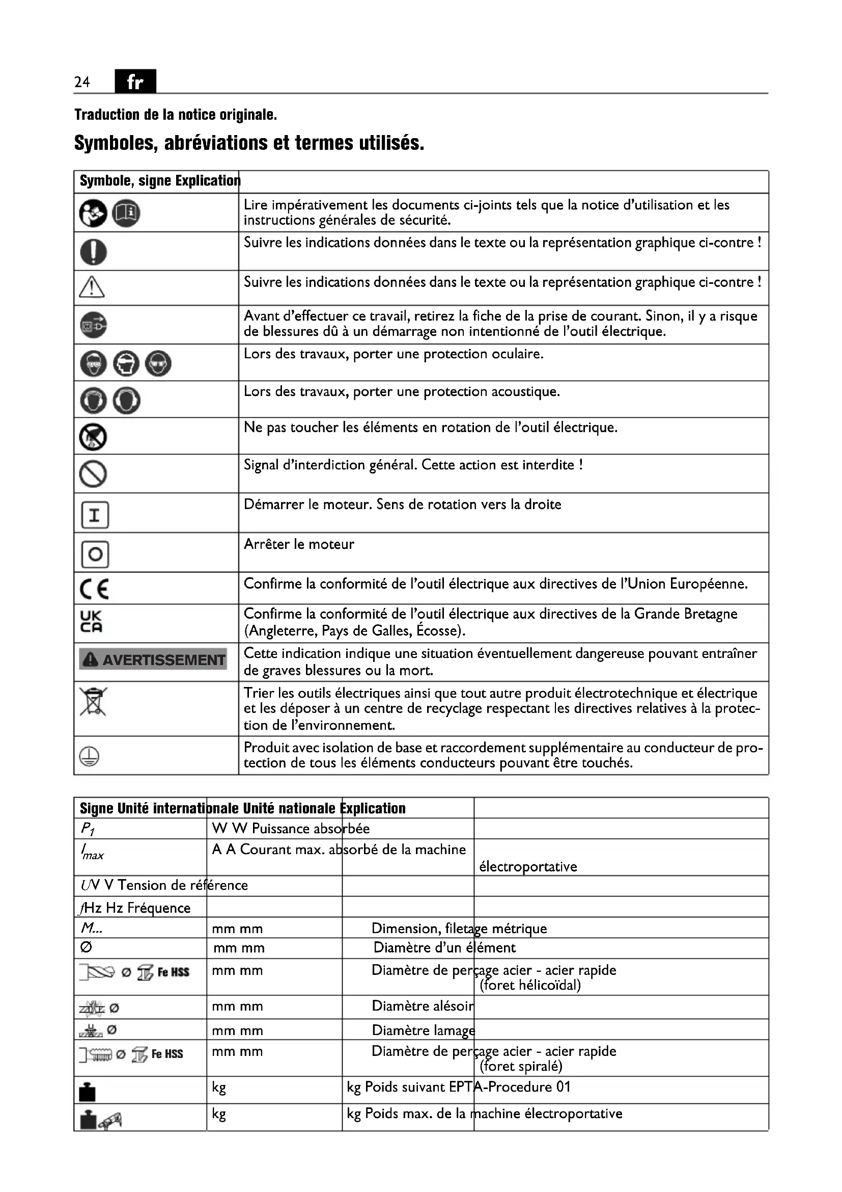 Traduction de la notice originale. Symboles, abréviations et termes utilisés. Symbole, signe Explication Lire impérativement les documents ci-joints tels que la notice d’utilisation et les instructions générales de sécurité. Suivre les indications données dans le texte ou la représentation graphique ci-contre ! Suivre les indications données dans le texte ou la représentation graphique ci-contre ! Avant d’effectuer ce travail, retirez la fiche de la prise de courant. Sinon, il y a risque de blessures dû à un démarrage non intentionné de l’outil électrique. Lors des travaux, porter une protection oculaire. Lors des travaux, porter une protection acoustique. Ne pas toucher les éléments en rotation de l’outil électrique. Signal d’interdiction général. Cette action est interdite ! Démarrer le moteur. Sens de rotation vers la droite Arrêter le moteur Confirme la conformité de l’outil électrique aux directives de l’Union Européenne. Confirme la conformité de l’outil électrique aux directives de la Grande Bretagne (Angleterre, Pays de Galles, Écosse). Cette indication indique une situation éventuellement dangereuse pouvant entraîner de graves blessures ou la mort. Trier les outils électriques ainsi que tout autre produit électrotechnique et électrique et les déposer à un centre de recyclage respectant les directives relatives à la protec- tion de l’environnement. Produit avec isolation de base et raccordement supplémentaire au conducteur de pro- tection de tous les éléments conducteurs pouvant être touchés. AVERTISSEMENT Signe Unité internationale Unité nationale Explication