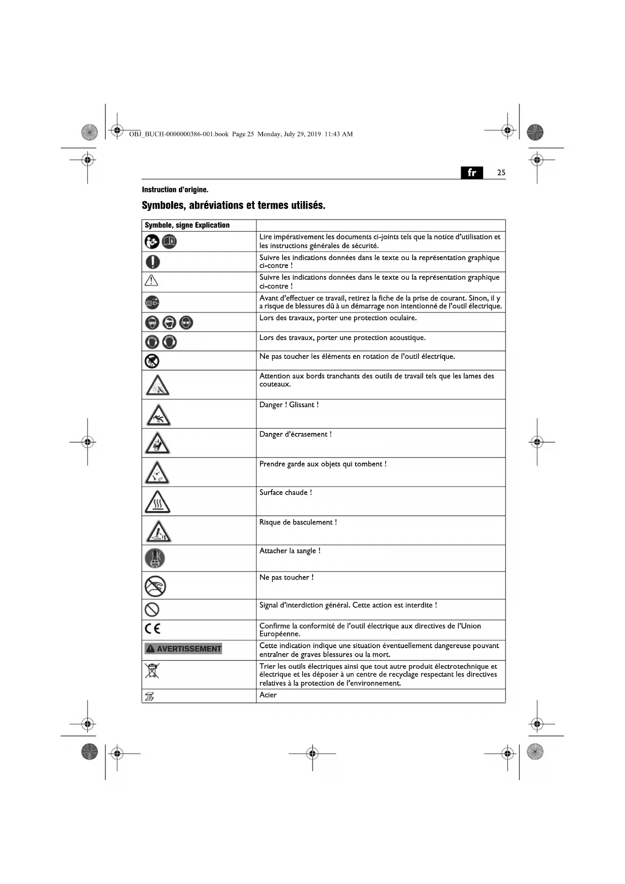 Instruction d’origine. Symboles, abréviations et termes utilisés. Symbole, signe Explication Lire impérativement les documents ci-joints tels que la notice d’utilisation et les instructions générales de sécurité. Suivre les indications données dans le texte ou la représentation graphique ci-contre ! Suivre les indications données dans le texte ou la représentation graphique ci-contre ! Avant d’effectuer ce travail, retirez la fiche de la prise de courant. Sinon, il y a risque de blessures dû à un démarrage non intentionné de l’outil électrique. Lors des travaux, porter une protection oculaire. Lors des travaux, porter une protection acoustique. Ne pas toucher les éléments en rotation de l’outil électrique. Attention aux bords tranchants des outils de travail tels que les lames des couteaux. Danger ! Glissant ! Danger d’écrasement ! Prendre garde aux objets qui tombent ! Surface chaude ! Risque de basculement ! Attacher la sangle ! Ne pas toucher ! Signal d’interdiction général. Cette action est interdite ! Confirme la conformité de l’outil électrique aux directives de l’Union Européenne. Cette indication indique une situation éventuellement dangereuse pouvant entraîner de graves blessures ou la mort. Trier les outils électriques ainsi que tout autre produit électrotechnique et électrique et les déposer à un centre de recyclage respectant les directives relatives à la protection de l’environnement. Acier AVERTISSEMENT OBJ_BUCH-0000000386-001.book Page 25 Monday, July 29, 2019 11:43 AM26