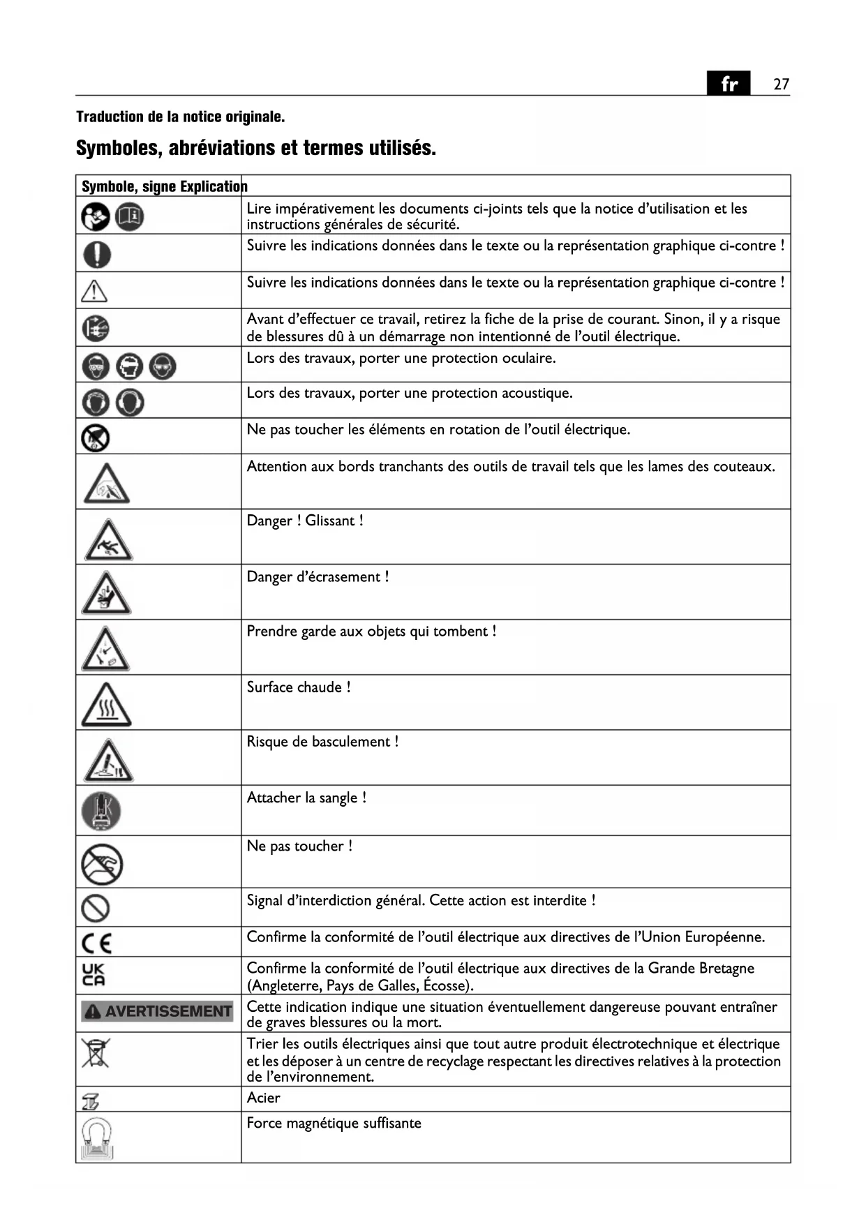 Traduction de la notice originale. Symboles, abréviations et termes utilisés. Symbole, signe Explication Lire impérativement les documents ci-joints tels que la notice d’utilisation et les instructions générales de sécurité. Suivre les indications données dans le texte ou la représentation graphique ci-contre ! Suivre les indications données dans le texte ou la représentation graphique ci-contre ! Avant d’effectuer ce travail, retirez la fiche de la prise de courant. Sinon, il y a risque de blessures dû à un démarrage non intentionné de l’outil électrique. Lors des travaux, porter une protection oculaire. Lors des travaux, porter une protection acoustique. Ne pas toucher les éléments en rotation de l’outil électrique. Attention aux bords tranchants des outils de travail tels que les lames des couteaux. Danger ! Glissant ! Danger d’écrasement ! Prendre garde aux objets qui tombent ! Surface chaude ! Risque de basculement ! Attacher la sangle ! Ne pas toucher ! Signal d’interdiction général. Cette action est interdite ! Confirme la conformité de l’outil électrique aux directives de l’Union Européenne. Confirme la conformité de l’outil électrique aux directives de la Grande Bretagne (Angleterre, Pays de Galles, Écosse). Cette indication indique une situation éventuellement dangereuse pouvant entraîner de graves blessures ou la mort. Trier les outils électriques ainsi que tout autre produit électrotechnique et électrique et les déposer à un centre de recyclage respectant les directives relatives à la protection de l’environnement. Acier Force magnétique suffisante AVERTISSEMENT28