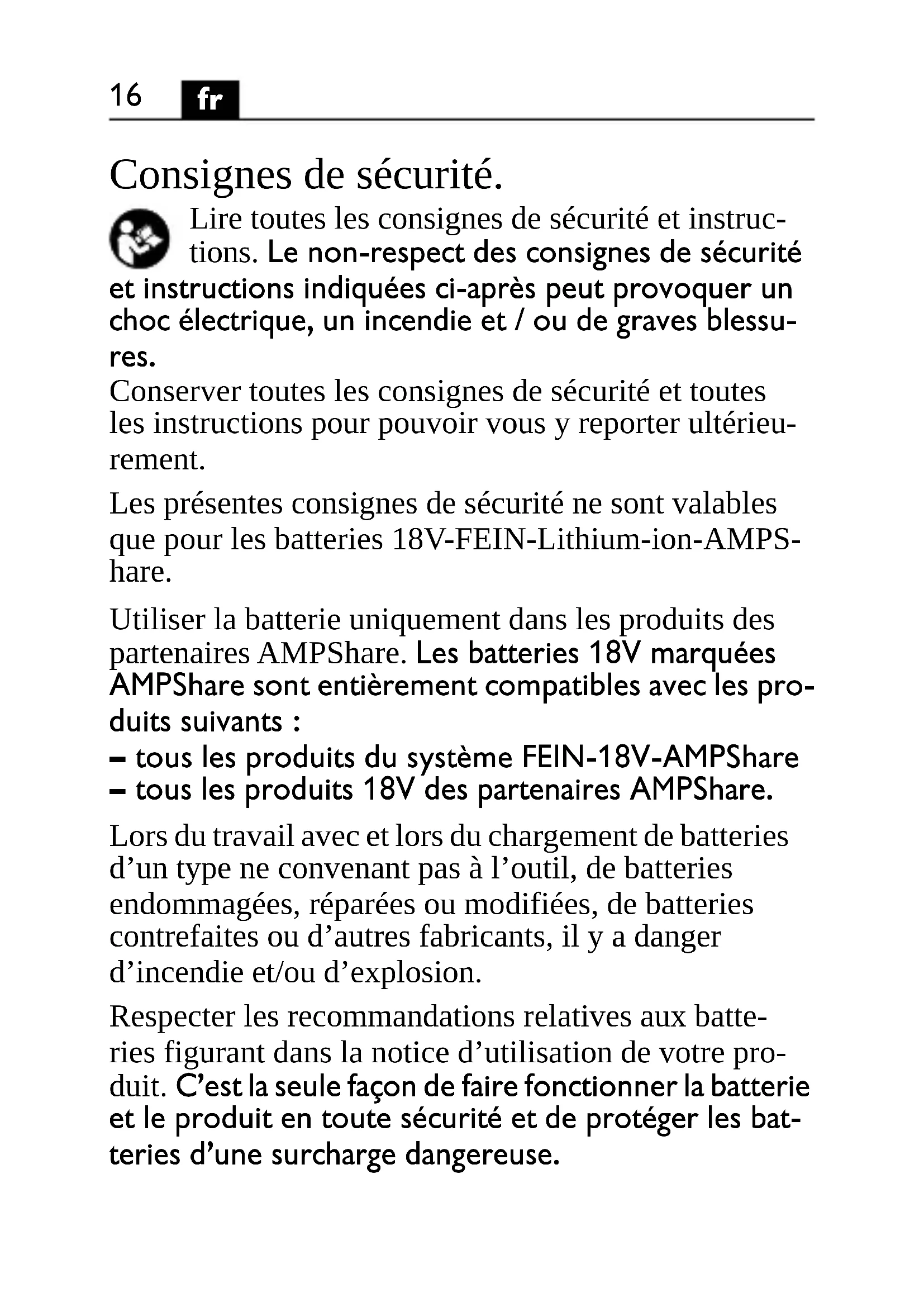 Consignes de sécurité. Lire toutes les consignes de sécurité et instruc- tions. Le non-respect des consignes de sécurité et instructions indiquées ci-après peut provoquer un choc électrique, un incendie et / ou de graves blessu- res. Conserver toutes les consignes de sécurité et toutes les instructions pour pouvoir vous y reporter ultérieu- rement. Les présentes consignes de sécurité ne sont valables que pour les batteries 18V-FEIN-Lithium-ion-AMPS- hare. Utiliser la batterie uniquement dans les produits des partenaires AMPShare. Les batteries 18V marquées AMPShare sont entièrement compatibles avec les pro- duits suivants : – tous les produits du système FEIN-18V-AMPShare – tous les produits 18V des partenaires AMPShare. Lors du travail avec et lors du chargement de batteries d’un type ne convenant pas à l’outil, de batteries endommagées, réparées ou modifiées, de batteries contrefaites ou d’autres fabricants, il y a danger d’incendie et/ou d’explosion. Respecter les recommandations relatives aux batte- ries figurant dans la notice d’utilisation de votre pro- duit. C’est la seule façon de faire fonctionner la batterie et le produit en toute sécurité et de protéger les bat- teries d’une surcharge dangereuse.17
