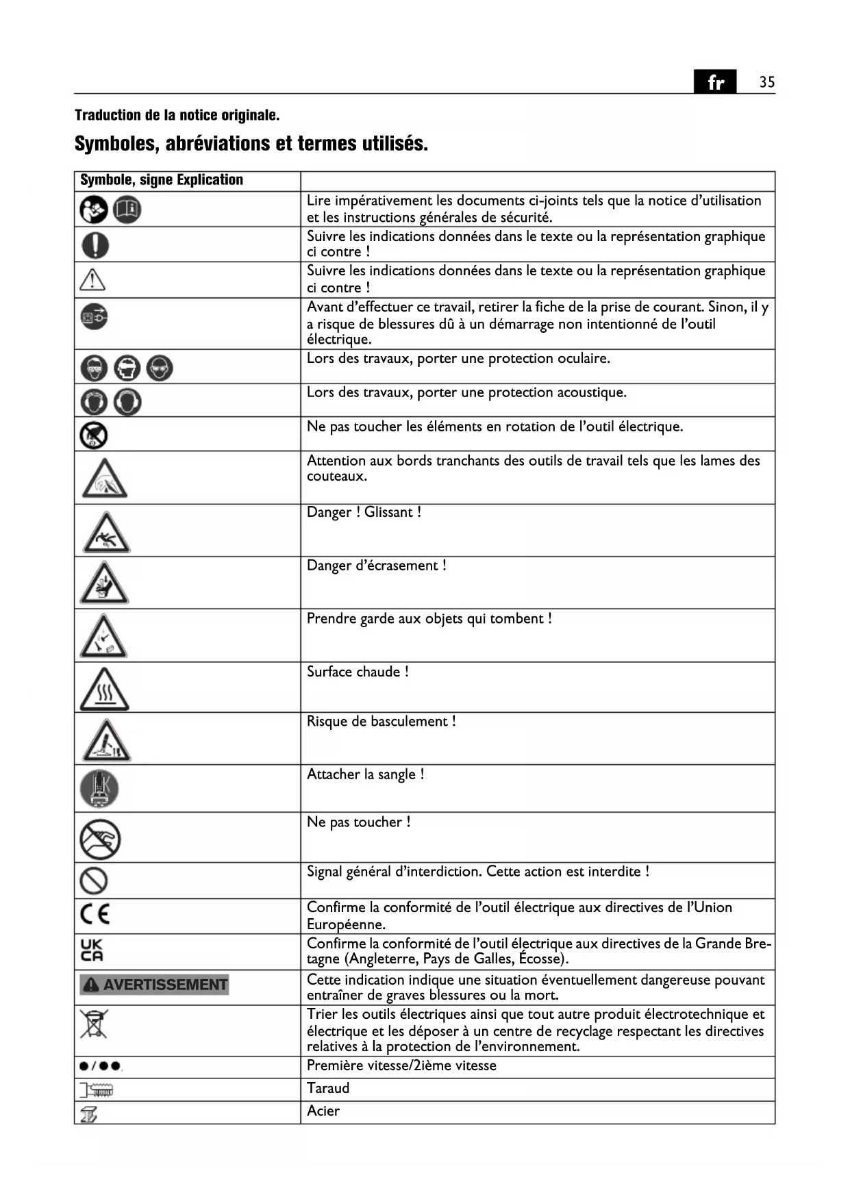 Traduction de la notice originale. Symboles, abréviations et termes utilisés. Symbole, signe Explication Lire impérativement les documents ci-joints tels que la notice d’utilisation et les instructions générales de sécurité. Suivre les indications données dans le texte ou la représentation graphique ci contre ! Suivre les indications données dans le texte ou la représentation graphique ci contre ! Avant d’effectuer ce travail, retirer la fiche de la prise de courant. Sinon, il y a risque de blessures dû à un démarrage non intentionné de l’outil électrique. Lors des travaux, porter une protection oculaire. Lors des travaux, porter une protection acoustique. Ne pas toucher les éléments en rotation de l’outil électrique. Attention aux bords tranchants des outils de travail tels que les lames des couteaux. Danger ! Glissant ! Danger d’écrasement ! Prendre garde aux objets qui tombent ! Surface chaude ! Risque de basculement ! Attacher la sangle ! Ne pas toucher ! Signal général d’interdiction. Cette action est interdite ! Confirme la conformité de l’outil électrique aux directives de l’Union Européenne. Confirme la conformité de l’outil électrique aux directives de la Grande Bre- tagne (Angleterre, Pays de Galles, Écosse). Cette indication indique une situation éventuellement dangereuse pouvant entraîner de graves blessures ou la mort. Trier les outils électriques ainsi que tout autre produit électrotechnique et électrique et les déposer à un centre de recyclage respectant les directives relatives à la protection de l’environnement. Première vitesse/2ième vitesse Taraud Acier AVERTISSEMENT36