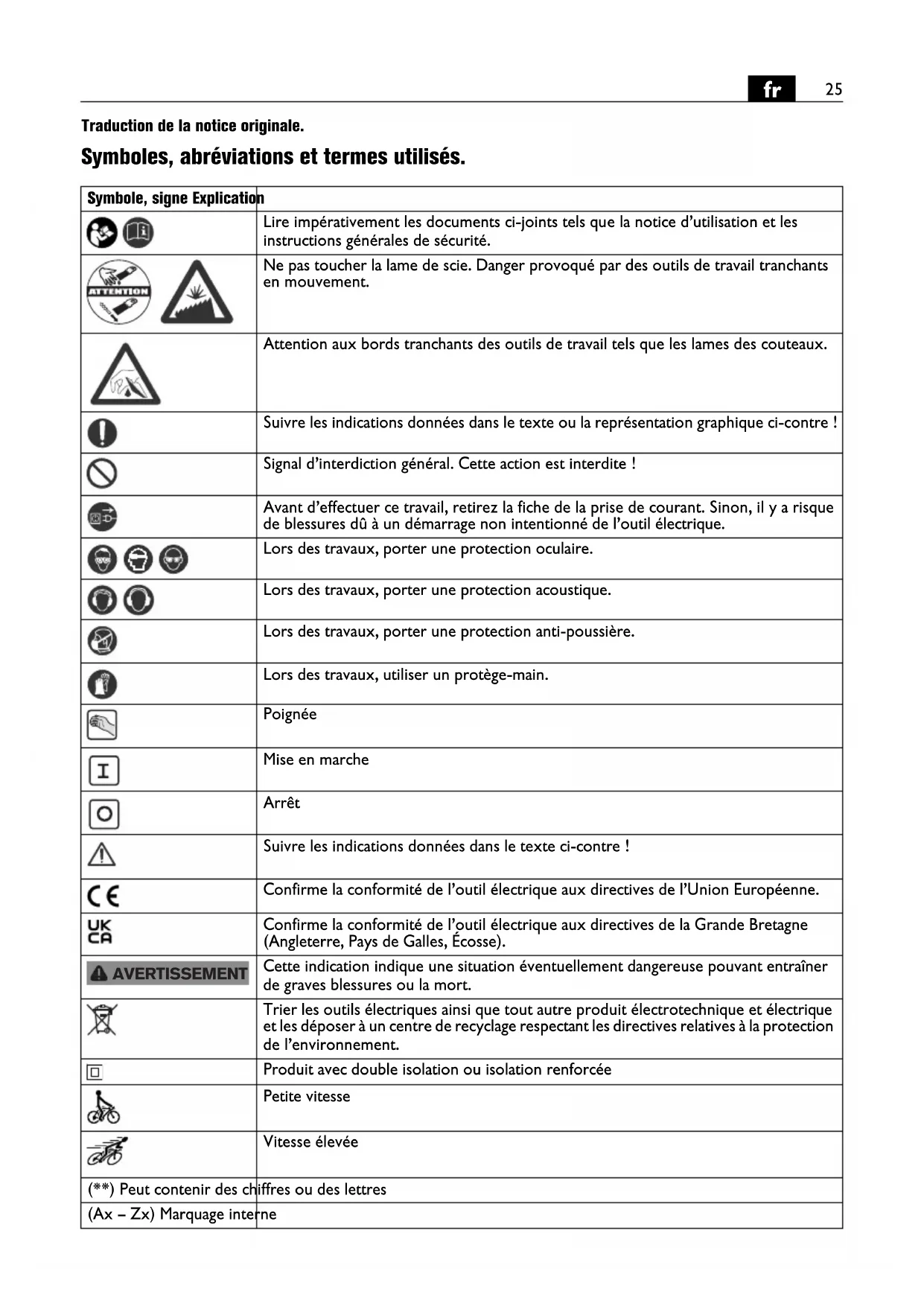Traduction de la notice originale. Symboles, abréviations et termes utilisés. Symbole, signe Explication Lire impérativement les documents ci-joints tels que la notice d’utilisation et les instructions générales de sécurité. Ne pas toucher la lame de scie. Danger provoqué par des outils de travail tranchants en mouvement. Attention aux bords tranchants des outils de travail tels que les lames des couteaux. Suivre les indications données dans le texte ou la représentation graphique ci-contre ! Signal d’interdiction général. Cette action est interdite ! Avant d’effectuer ce travail, retirez la fiche de la prise de courant. Sinon, il y a risque de blessures dû à un démarrage non intentionné de l’outil électrique. Lors des travaux, porter une protection oculaire. Lors des travaux, porter une protection acoustique. Lors des travaux, porter une protection anti-poussière. Lors des travaux, utiliser un protège-main. Poignée Mise en marche Arrêt Suivre les indications données dans le texte ci-contre ! Confirme la conformité de l’outil électrique aux directives de l’Union Européenne. Confirme la conformité de l’outil électrique aux directives de la Grande Bretagne (Angleterre, Pays de Galles, Écosse). Cette indication indique une situation éventuellement dangereuse pouvant entraîner de graves blessures ou la mort. Trier les outils électriques ainsi que tout autre produit électrotechnique et électrique et les déposer à un centre de recyclage respectant les directives relatives à la protection de l’environnement. Produit avec double isolation ou isolation renforcée Petite vitesse Vitesse élevée (**) Peut contenir des chiffres ou des lettres (Ax – Zx) Marquage interne AVERTISSEMENT26