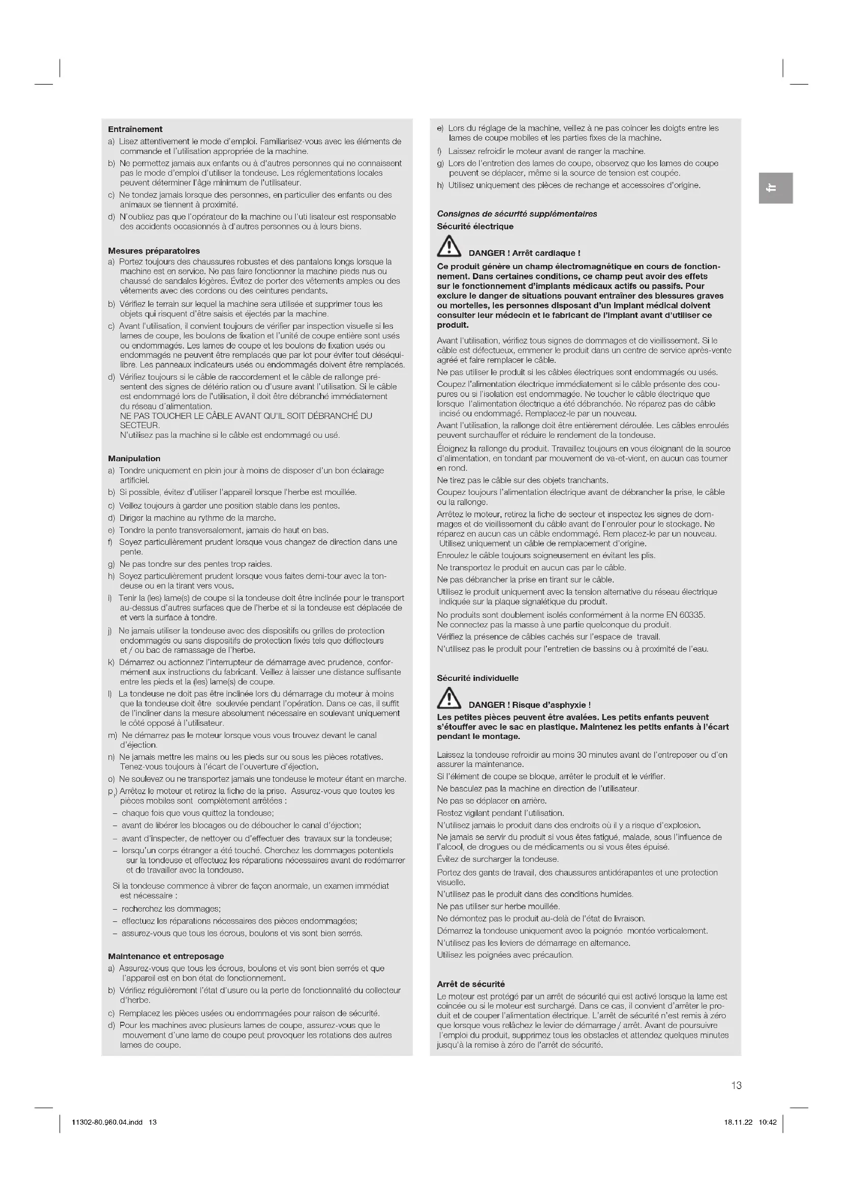 ) Arrêtez le moteur et retirez la fiche de la prise. Assurez-vous que toutes les pièces mobiles sont complètement arrêtées : – chaque fois que vous quittez la tondeuse; – avant de libérer les blocages ou de déboucher le canal d’éjection; – avant d’inspecter, de nettoyer ou d’effectuer des travaux sur la tondeuse; – lorsqu’un corps étranger a été touché. Cherchez les dommages potentiels sur la tondeuse et effectuez les réparations nécessaires avant de redémarrer et de travailler avec la tondeuse. Si la tondeuse commence à vibrer de façon anormale, un examen immédiat est nécessaire : – recherchez les dommages; – effectuez les réparations nécessaires des pièces endommagées; – assurez-vous que tous les écrous, boulons et vis sont bien serrés. Maintenance et entreposage a) Assurez-vous que tous les écrous, boulons et vis sont bien serrés et que l’appareil est en bon état de fonctionnement. b) Vérifiez régulièrement l’état d’usure ou la perte de fonctionnalité du collecteur d’herbe. c) Remplacez les pièces usées ou endommagées pour raison de sécurité. d) Pour les machines avec plusieurs lames de coupe, assurez-vous que le mouvement d’une lame de coupe peut provoquer les rotations des autres lames de coupe. e) Lors du réglage de la machine, veillez à ne pas coincer les doigts entre les lames de coupe mobiles et les parties fixes de la machine. f) Laissez refroidir le moteur avant de ranger la machine. g) Lors de l’entretien des lames de coupe, observez que les lames de coupe peuvent se déplacer, même si la source de tension est coupée. h) Utilisez uniquement des pièces de rechange et accessoires d’origine. Consignes de sécurité supplémentaires Sécurité électrique DANGER! Arrêt cardiaque! Ce produit génère un champ électromagnétique en cours de fonction- nement. Dans certaines conditions, ce champ peut avoir des effets sur le fonctionnement d’implants médicaux actifs ou passifs. Pour exclure le danger de situations pouvant entraîner des blessures graves ou mortelles, les personnes disposant d’un implant médical doivent consulter leur médecin et le fabricant de l’implant avant d’utiliser ce produit. Avant l’utilisation, vérifiez tous signes de dommages et de vieillissement. Si le câble est défectueux, emmener le produit dans un centre de service après-vente agréé et faire remplacer le câble. Ne pas utiliser le produit si les câbles électriques sont endommagés ou usés. Coupez l’alimentation électrique immédiatement si le câble présente des cou- pures ou si l’isolation est endommagée. Ne toucher le câble électrique que lorsque l’alimentation électrique a été débranchée. Ne réparez pas de câble incisé ou endommagé. Remplacez-le par un nouveau. Avant l’utilisation, la rallonge doit être entièrement déroulée. Les câbles enroulés peuvent surchauffer et réduire le rendement de la tondeuse. Éloignez la rallonge du produit. Travaillez toujours en vous éloignant de la source d’alimentation, en tondant par mouvement de va-et-vient, en aucun cas tourner en rond. Ne tirez pas le câble sur des objets tranchants. Coupez toujours l’alimentation électrique avant de débrancher la prise, le câble ou la rallonge. Arrêtez le moteur, retirez la fiche de secteur et inspectez les signes de dom- mages et de vieillissement du câble avant de l’enrouler pour le stockage. Ne réparez en aucun cas un câble endommagé. Rem placez-le par un nouveau. Utilisez uniquement un câble de remplacement d’origine. Enroulez le câble toujours soigneusement en évitant les plis. Ne transportez le produit en aucun cas par le câble. Ne pas débrancher la prise en tirant sur le câble. Utilisez le produit uniquement avec la tension alternative du réseau électrique indiquée sur la plaque signalétique du produit. No produits sont doublement isolés conformément à la norme EN 60335. Ne connectez pas la masse à une partie quelconque du produit. Vérifiez la présence de câbles cachés sur l’espace de travail. N’utilisez pas le produit pour l’entretien de bassins ou à proximité de l’eau. Sécurité individuelle DANGER! Risque d’asphyxie! Les petites pièces peuvent être avalées. Les petits enfants peuvent s’étouffer avec le sac en plastique. Maintenez les petits enfants à l’écart pendant le montage. Laissez la tondeuse refroidir au moins 30 minutes avant de l’entreposer ou d’en assurer la maintenance. Si l’élément de coupe se bloque, arrêter le produit et le vérifier. Ne basculez pas la machine en direction de l’utilisateur. Ne pas se déplacer en arrière. Restez vigilant pendant l’utilisation. N’utilisez jamais le produit dans des endroits où il y a risque d’explosion. Ne jamais se servir du produit si vous êtes fatigué, malade, sous l’influence de l’alcool, de drogues ou de médicaments ou si vous êtes épuisé. Évitez de surcharger la tondeuse. Portez des gants de travail, des chaussures antidérapantes et une protection visuelle. N’utilisez pas le produit dans des conditions humides. Ne pas utiliser sur herbe mouillée. Ne démontez pas le produit au-delà de l’état de livraison. Démarrez la tondeuse uniquement avec la poignée montée verticalement. N’utilisez pas les leviers de démarrage en alternance. Utilisez les poignées avec précaution. Arrêt de sécurité Le moteur est protégé par un arrêt de sécurité qui est activé lorsque la lame est coincée ou si le moteur est surchargé. Dans ce cas, il convient d’arrêter le pro- duit et de couper l’alimentation électrique. L’arrêt de sécurité n’est remis à zéro que lorsque vous relâchez le levier de démarrage / arrêt. Avant de poursuivre l’emploi du produit, supprimez tous les obstacles et attendez quelques minutes jusqu’à la remise à zéro de l’arrêt de sécurité. 11302-80.960.04.indd 1311302-80.960.04.indd 13 18.11.22 10:4218.11.22