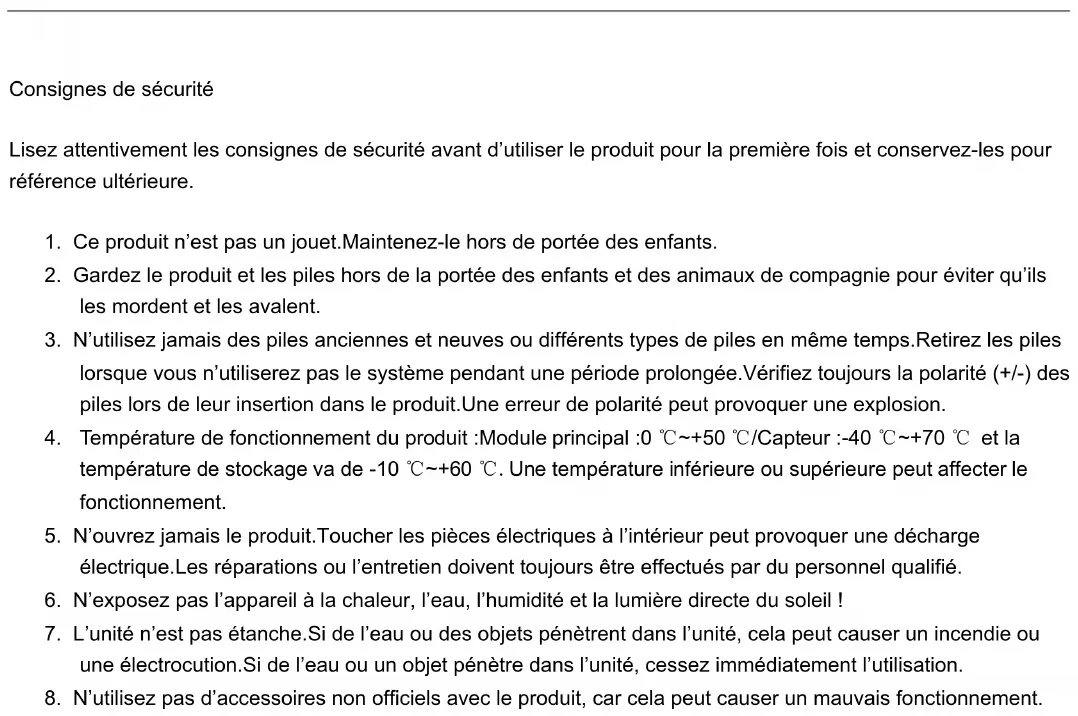 - Température de fonctionnement du produit : Module principal : 0 °C~+50 °C / Capteur : -40 °C~+70 °C et la température de stockage va de -10 °C~+60 °C. Une température inférieure ou supérieure peut affecter le fonctionnement.