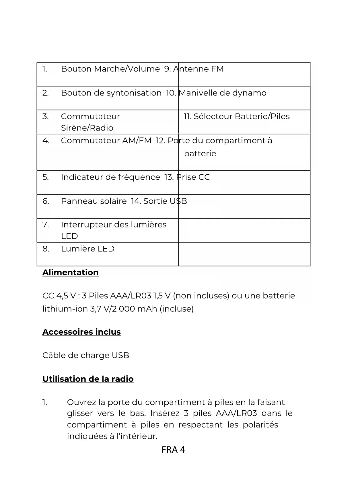 | 3. Commutateur Sirène/Radio | 11. Sélecteur Batterie/Piles |