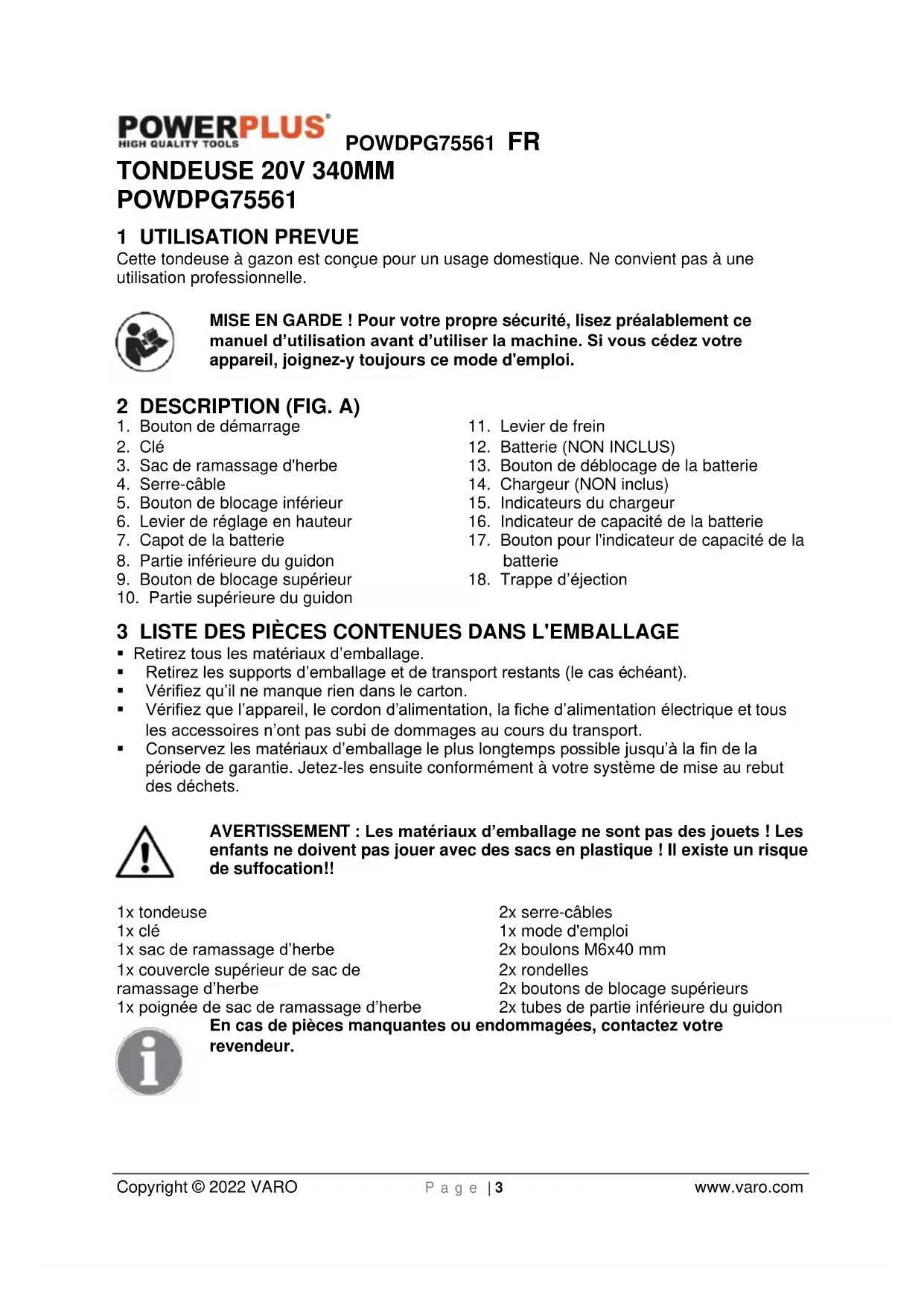 - Votre outil doit être chargé au moins 1 fois par mois afin de garantir un fonctionnement optimal de cet outil. 15 ENVIRONNEMENT Si, après un certain temps, vous décidez de remplacer votre machine, ne vous en débarrassez pas avec les ordures ménagères, mais destinez-la à un traitement respectueux de l'environnement. Les déchets électriques ne peuvent être traités de la même manière que les ordures ménagères ordinaires. Procédez à leur recyclage, là où il existe des installations adéquates. Renseignez-vous à propos des procédés de collecte et de traitement auprès des autorités locales compétentes ou de votre revendeur.POWDPG75561 EN Copyright © 2022 VARO P a g e | 1 www.varo.com 1 INTENDED USE ............................................................................... 3