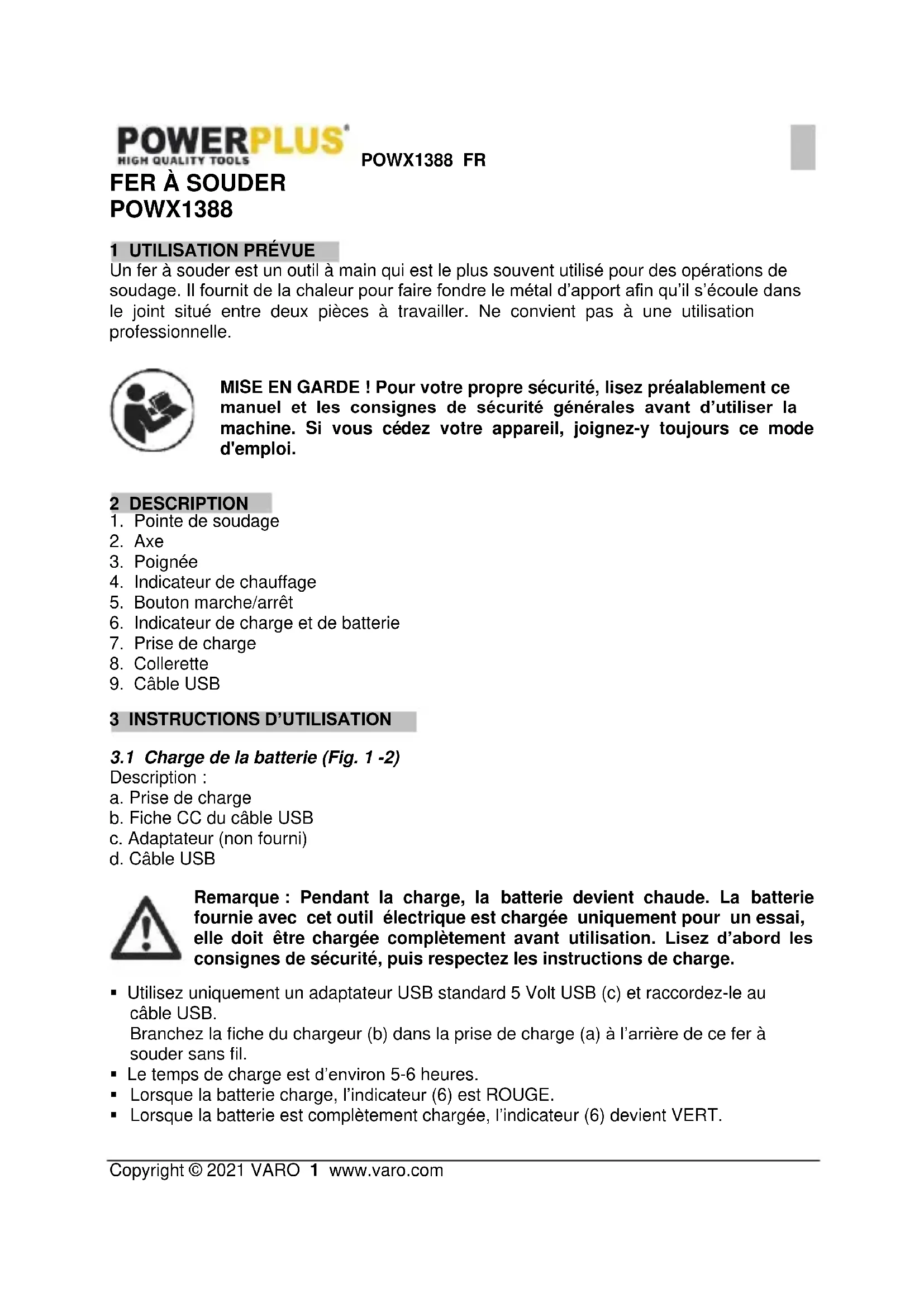 température peut atteindre 400 °C. Tenez le fer à souder en mettant la pointe en contact avec la pièce à travailler pendant quelques secondes pour lui permettre de chauffer. Posez lentement du métal d’apport sur le joint, pas sur le fer à souder, ce qui permet au métal d’apport de fondre sur le joint. Une fois que le métal d’apport a été appliqué sur le joint, immobilisez la pièce à travailler tout en retirant simultanément le métal d’apport et le fer à souder. REMARQUE : Un joint à brasure tendre réussi est lisse et brillant. Dans le cas contraire, vous devrez chauffer de nouveau le joint et appliquer de nouveau du métal d’apport. REMARQUE : La pointe de soudage est conçue pour une très longue durée de service, par conséquent, vous n’avez pas besoin de la remplacer dans des conditions d’utilisation normales.POWX1388 EN Copyright © 2021 VARO 1 www.varo.com SOLDERING IRON POWX1388 1 INTENDED USE A soldering iron is a hand tool most commonly used in soldering. It supplies heat to melt the solder so that it can flow into the joint between two metal workpieces. Not suitable for professional use. WARNING! For your own safety, read this manual and the general safety instructions carefully before using the appliance. Your power tool should only be given to other users together with these instructions. 2 DESCRIPTION (FIG. A)