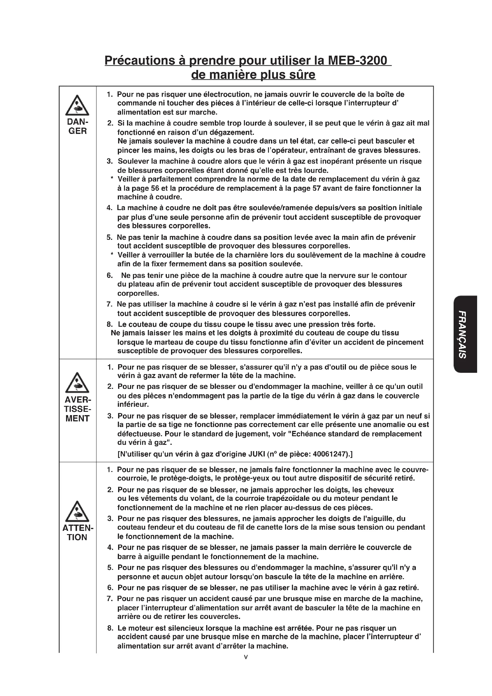- de la machine à coudre depuis/verssa position initiale.viii Sceau d’avertis- sement de ten- sion dangereuse Il s’agit du sceau d’avertissement dont l’objectif est d’empêcher une électrocution. Sceau d’avertis- sement de tension dangereuse Il s’agit d’une étiquette d’aver- tissement pour éviter de se pincer les mains entre le plateau et la machine à coudre lorsque celle-ci est ramenée à sa position initiale. Étiquette du centre de gravité de la charge Cette étiquette indique le centre de gravité de la machine Sceau d’aver- tissement de tension dangereuse Il s’agit du sceau d’ avertisse- ment dont l’ objectif est d’empêcher une électro- cution. Étiquette d’avertissement pour éviter de se pincer Il s’agit d’une étiquette d’ avertissement pour éviter de se pincer les doigts et les mains dans la courroie de distribution. Étiquette d’avertis- sement pour éviter de se pincer Il s’agit d’une étiquette d’avertis- sement pour éviter de se pincer les doigts et les mains entre le plateau et la machine à coudre lorsque celle-ci est soulevée de sa position initiale. Étiquette d’avertissement pour éviter de se pincer Il s’agit d’une étiquette d’avertissement pour éviter de se pincer les doigts et les mains dans le couteau de coupe du tissu. Étiquette d’inter- diction de saisie, bande jaune Il s’agit d’une éti- quette d’avertisse- ment pour indiquer une pièce à ne pas saisir de la main lors du soulève- ment de la machine à coudre depuis sa position initiale. Étiquette d’avertisse- ment pour éviter de se pincer Il s’agit d’une étiquette d’avertis- sement pour éviter de se pincer les doigts et les mains dans la butée de la charnière.ix FRANÇAIS SOMMAIRE (3) Sélection des couteaux de coupe antérieure/coupepostérieure p. 22