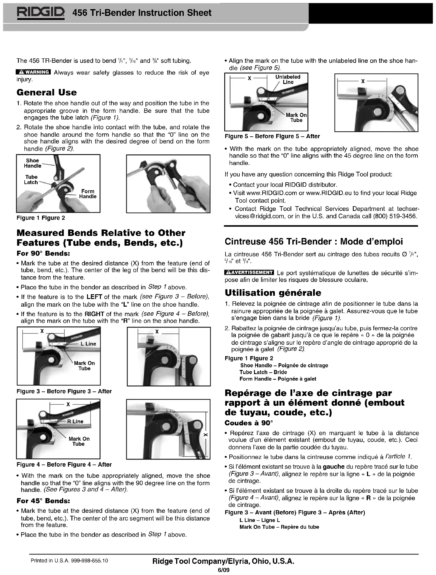 - Si l’élément existant se trouve à la droite du repère tracé sur le tube (Figure 4 – Avant) , alignez le repère sur la ligne « R » de la poignée de cintrage. Figure 3 – Avant (Before) Figure 3 – Après (After) Ridge Tool Company/Elyria, Ohio, U.S.A. 6/09 Printed in U.S.A. 999-998-655.10 456 Tri-Bender Instruction Sheet