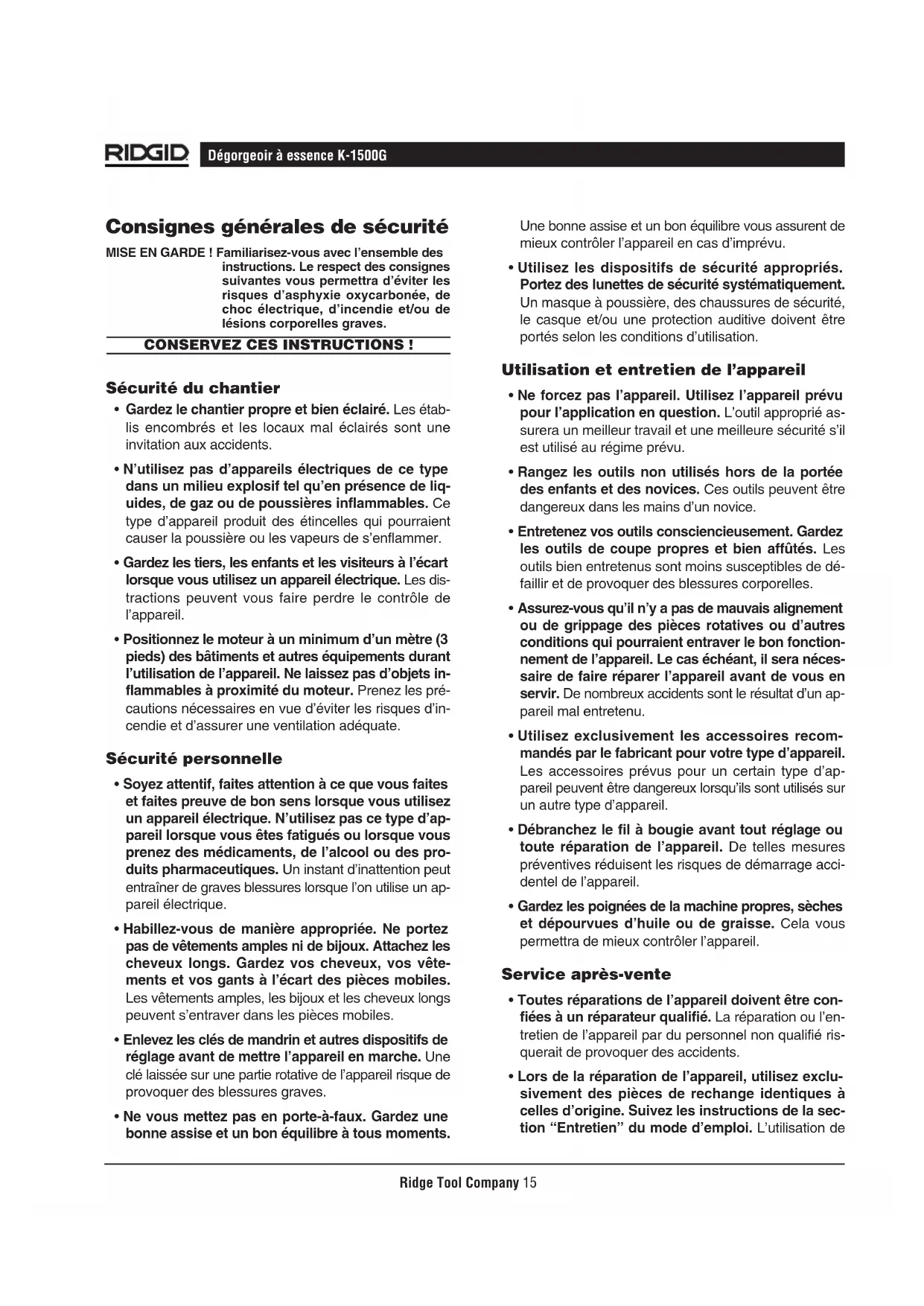 - Lors de la réparation de l’appareil, utilisez exclu- sivement des pièces de rechange identiques à celles d’origine. Suivez les instructions de la sec- tion “Entretien” du mode d’emploi. L’utilisation deRidge Tool Company16 Dégorgeoir à essence K-1500G pièces de rechange non homologuées et le non-respect des consignes d’entretien peut créer un risque de choc électrique ou de blessure corporelle. Consignes de sécurité particulières MISE EN GARDE ! Lisez soigneusement ce mode d’emploi avant d’utiliser le dégorgeoir à essence K-1500G. Le non- respect de son contenu augmenterait les risques d’asphyxie oxycarbonée, d’incendie et/ou de graves lésions corporelles. Veuillez adresser toutes questions éventuelles aux ser- vices techniques de la Ridge Tool Company en composant le (800) 519-3456. Sécurité de la machine