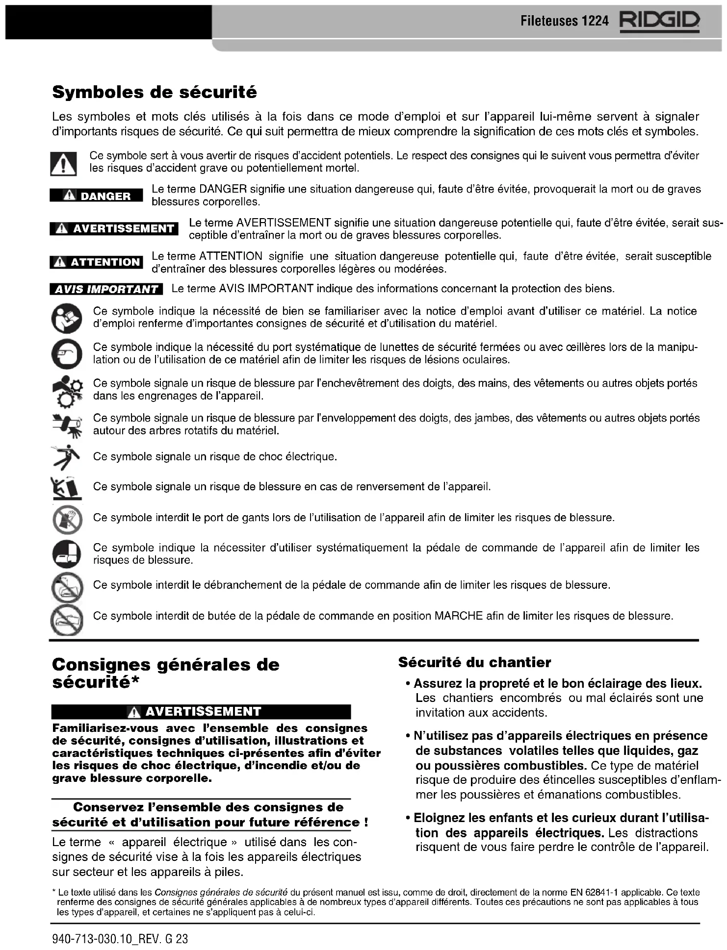 - Confiez la révision de votre appareil électrique à un réparateur qualifié utilisant exclusivement des pièces de rechange d’origine. Cela assurera la sécu- rité opérationnelle de l’appareil. Consignes de sécurité spécifiques AVERTISSEMENT La section suivante contient d’importantes con- signes de sécurité visant ce type d’appareil en par- ticulier. Afin de limiter les risques de choc électrique et autres lésions corporelles graves, familiarisez-vous avec celles-ci avant d’utiliser la fileteuse RIDGID