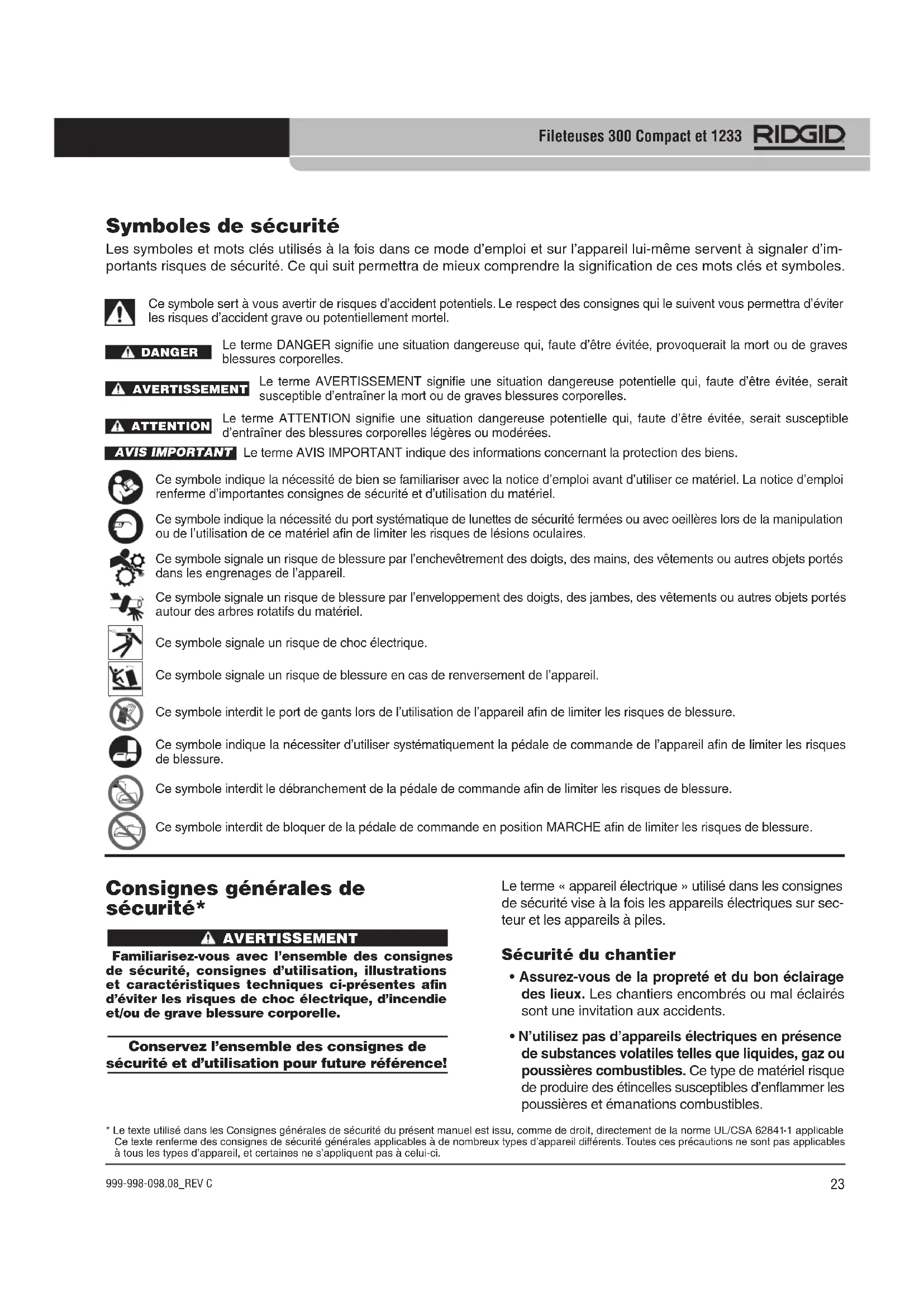 Pour la liste complète des accessoires RIDGID prévus pour les fileteuses 300 Compact et 1233, consultez le catalogue RIDGID en ligne à RIDGID.com ou les services techniques de Ridge Tool en composant le 844-789-8665.