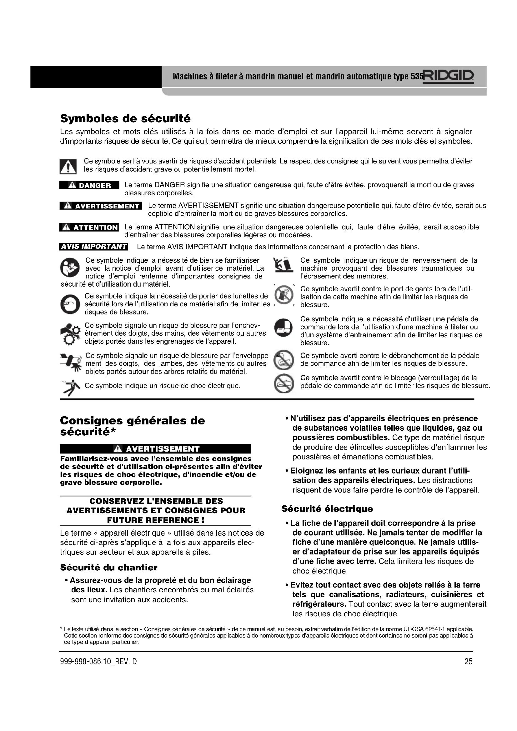 - Afin de limiter les risques de grave blessure cor- porelle, familiarisez-vous avec les consignes ci- présentes, ainsi que celles visant l’ensemble du matériel associé, avant d’utiliser cette machine. En cas de questions concernant ce produit RIDGID