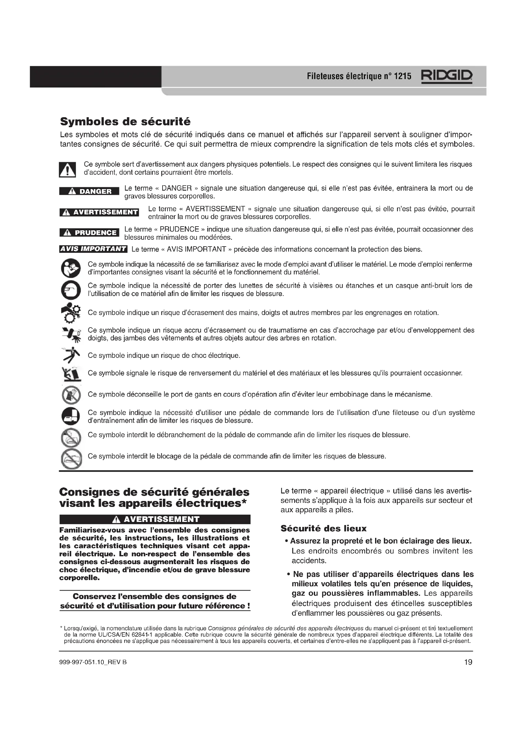 - Ne pas utiliser d’appareils électriques dans les milieux volatiles tels qu’en présence de liquides, gaz ou poussières inflammables. Les appareils électriques produisent des étincelles susceptibles d’enflammer les poussières ou gaz présents. Symboles de sécurité Les symboles et mots clé de sécurité indiqués dans ce manuel et affichés sur l’appareil servent à souligner d’impor- tantes consignes de sécurité. Ce qui suit permettra de mieux comprendre la signification de tels mots clés et symboles. Ce symbole sert d’avertissement aux dangers physiques potentiels. Le respect des consignes qui le suivent limitera les risques d’accident, dont certains pourraient être mortels. Le terme « DANGER » signale une situation dangereuse qui, si elle n’est pas évitée, entrainera la mort ou de graves blessures corporelles. Le terme « AVERTISSEMENT » signale une situation dangereuse qui, si elle n’est pas évitée, pourrait entrainer la mort ou de graves blessures corporelles. Le terme « PRUDENCE » indique une situation dangereuse qui, si elle n’est pas évitée, pourrait occasionner des blessures minimales ou modérées. Le terme « AVIS IMPORTANT » précède des informations concernant la protection des biens. Ce symbole indique la nécessité de se familiarisez avec le mode d’emploi avant d’utiliser le matériel. Le mode d’emploi renferme d’importantes consignes visant la sécurité et le fonctionnement du matériel. Ce symbole indique la nécessité de porter des lunettes de sécurité à visières ou étanches et un casque anti-bruit lors de l’utilisation de ce matériel afin de limiter les risques de blessure. AVIS IMPORTANT DANGER AVERTISSEMENT PRUDENCE Ce symbole indique un risque de choc électrique. Ce symbole signale le risque de renversement du matériel et des matériaux et les blessures qu’ils pourraient occasionner. Ce symbole déconseille le port de gants en cours d’opération afin d’éviter leur embobinage dans le mécanisme. Ce symbole indique la nécessité d’utiliser une pédale de commande lors de l’utilisation d’une fileteuse ou d’un système d’entraînement afin de limiter les risques de blessure. Ce symbole interdit le débranchement de la pédale de commande afin de limiter les risques de blessure. Ce symbole interdit le blocage de la pédale de commande afin de limiter les risques de blessure.