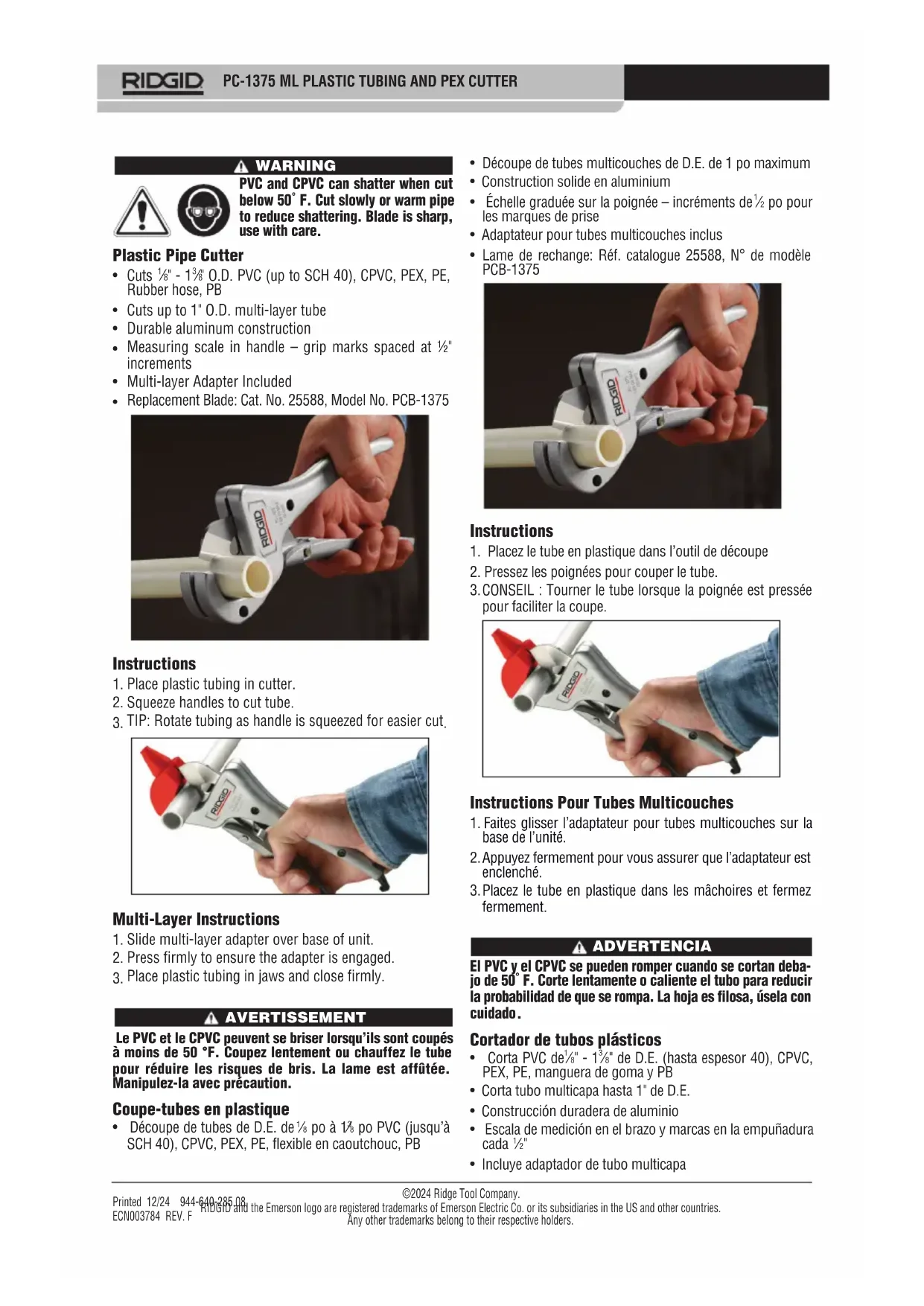Découpe de tubes multicouches de D.E. de 1 po maximum• Construction solide en aluminium• Échelle graduée sur la poignée – incréments de ⁄2 po pour les marques de prise• Adaptateur pour tubes multicouches inclus