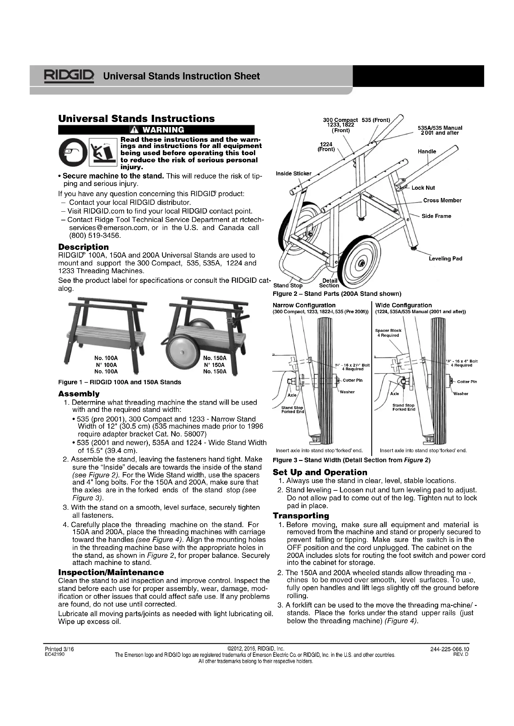Universal Stands Instruction Sheet Figure 4 – 535 Threading Machine Mounted on 200A Stand Utilisation des supports universels AVERTISSEMENT Afin de limiter les risques d’accidentgrave, familiarisez-vous avec le con-tenu de cette notice, ainsi qu’avec lesconsignes d’utilisation et de sécuritéde l’ensemble du matériel présentavant d’employer ce dispositif.• Arrimez la machine au support. Cela limitera les risques derenversement et de grave blessure corporelle.En cas de questions concernant ce produit RIDGID veuillez : – Consulter le distributeur RIDGID le plus proche ;– Visiter le site RIDGID.com afin de localiser le re présentantRIDGID le plus proche ;– Consulter les services techniques Ridge Tool par mail adresséà rtctechservices@emerson.com, ou bien en appelant le(800) 519-3456 (à partir des Etats-Unis ou du Canada exclu-sivement).Figure 1 – Supports RIDGID 100A et 150A (se reporter à la Figure 1de la version anglaise) Description Les supports universels type RIDGID 100A, 150A et 200A ser-vent au montage et soutien des machines à fileter type 300Compact, 535, 535A, 1224 et 1233.Les applications correspondantes sont affichées sur les éti-quettes du matériel et sur le catalogue RIDGID. Assembly 1. Réglez la largeur d’assise du support en fonction de lamachine à fileter utilisée ;• Assise étroite (12"/30.5 cm) pour les 535 d’avant 2001, les300 Compact et les 1233• Assise élargie (15,5"/39,4 cm) pour les 535 d’après 2001 etles 1224.2. Assemblez le support en vissant sa quincaillerie à la main.Assurez-vous que ses autocollants intérieurs se trouvent àl’intérieur du support (Figure 2). Pour l’assise élargie, ajoutezles écarteurs et long boulons de 4 pouces prévus. Lors dumontage d’une 150A ou 200A, assurez-vous que leursaxes s’engagent dans les fourches de la butée du support(Figure 3).