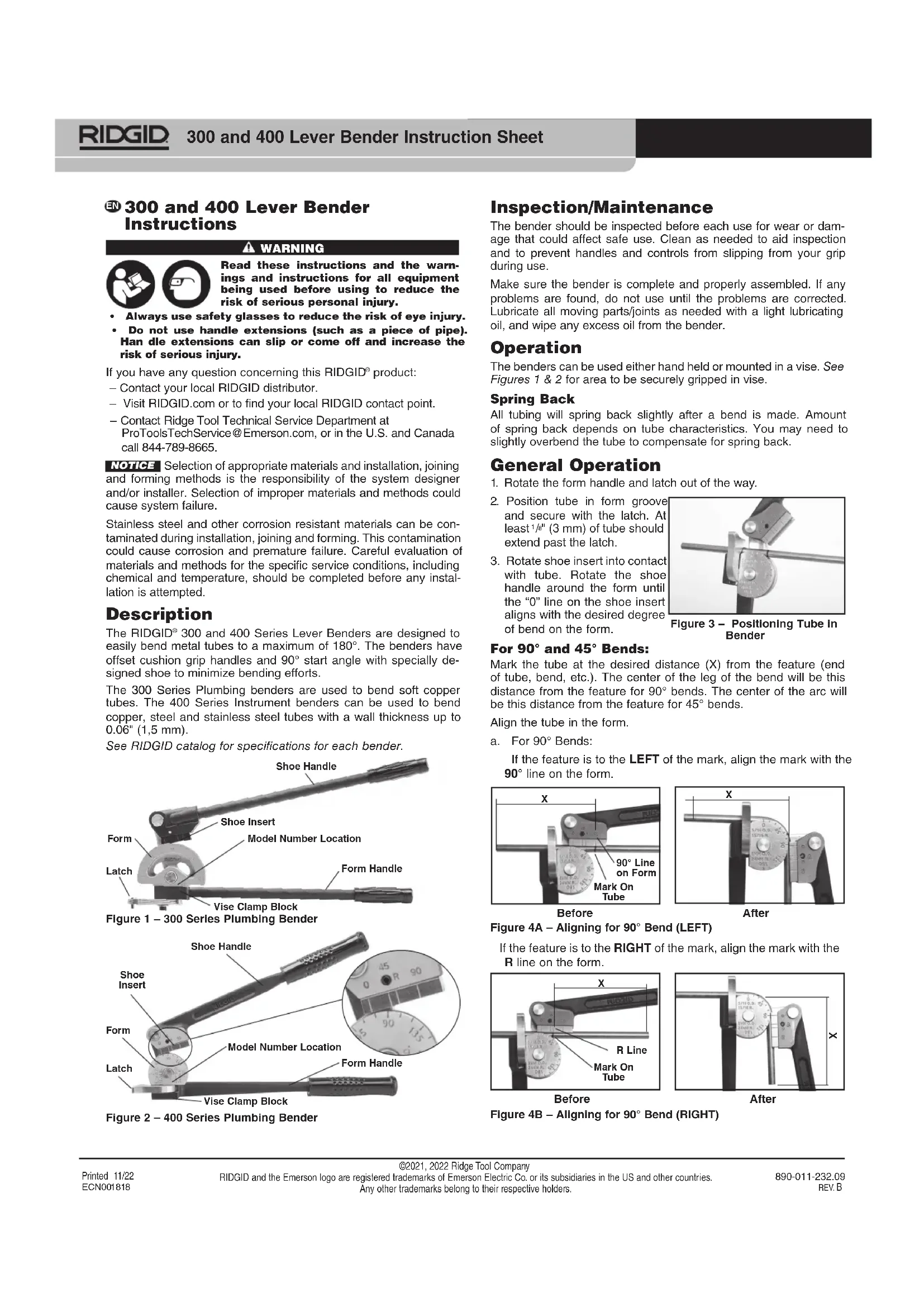- Graduations métriques et impériales. NOTA ! Les facteurs de compensation indiqués représentent des valeurs théoriques calculées. Différents types de matériaux et différentes épaisseurs de parois pourront nécessiter plus ou moins de compensation. A – Tube rectiligne avec repères B – Tube coudé aux axes Figure 7 – Exemple d’application des valeurs de compensation Instrucciones para dobladoras de palanca 300 y 400 ADVERTENCIALea estas instrucciones y las adverten-cias e instrucciones de todos los equipos utilizados antes de usarlos, para reducir el riesgo de lesiones personales graves. • Siempre use gafas de seguridad para reducir el riesgo de lesiones a los ojos. • No use extensiones de los mangos (tales como un trozo de tubo). Las extensiones de los mangos se pueden deslizar o salir, lo cual aumenta el riesgo de lesiones graves. b. Pour les coudes à 45°, alignez le repère « 45° » du gabarit. Figure 5 – Alignement pour coude à 45° Tube déporté avec coudes à 45°