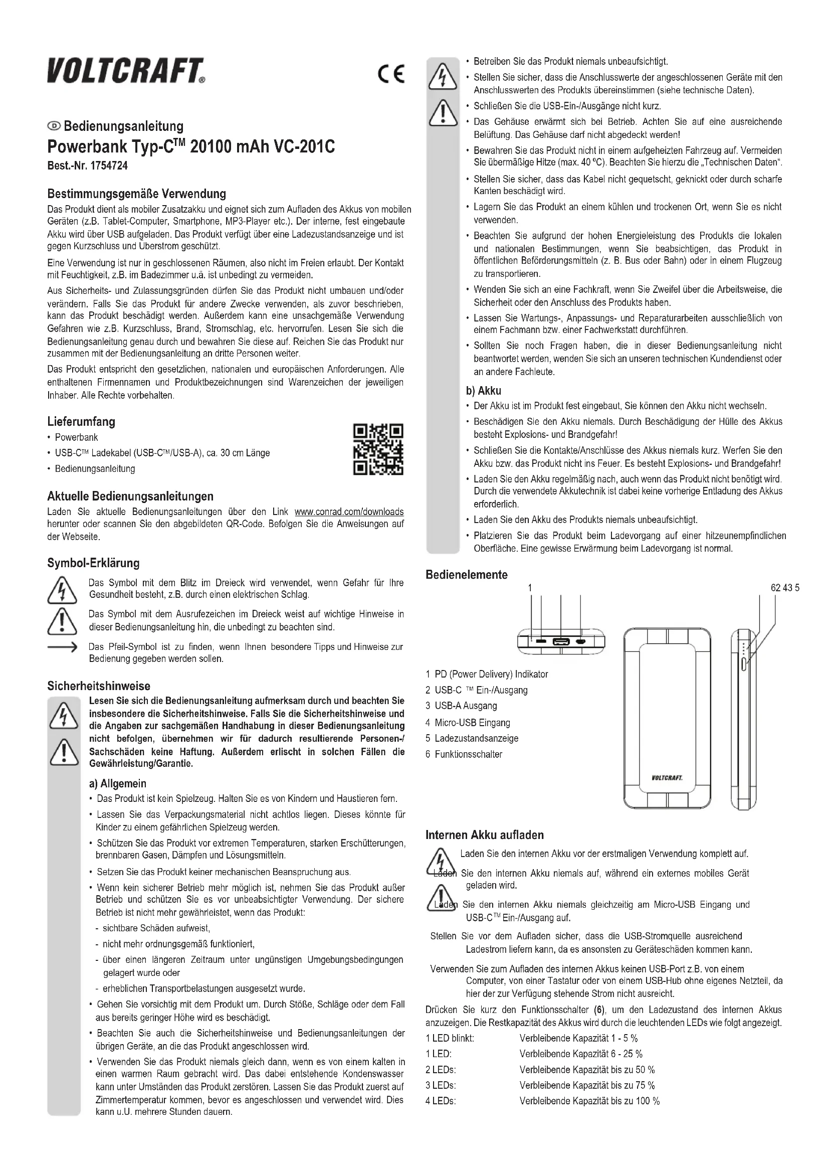 20 100 mAh VC-201C Nº de commande 1754724 Utilisation prévue Ce produit sert d’accumulateur supplémentaire portable pour la charge des accumulateurs d’appareils portables (p. ex. tablettes, smartphones, lecteurs MP3, etc.). L’accumulateur interne intégré est rechargé via USB. Le produit dispose d’un indicateur d’état de charge et est protégé contre les courts-circuits et la les surintensités.L’utilisation est uniquement autorisée en intérieur, dans des locaux fermés ; l’utilisation en plein air est interdite. Évitez impérativement tout contact avec l’humidité, par ex. dans la salle de bains, etc. Pour des raisons de sécurité et d’homologation, toute transformation et/ou modication du produit est interdite. Si vous utilisez le produit à des ns autres que celles décrites précédemment, vous risquez de l’endommager. Par ailleurs, une utilisation incorrecte peut être source de dangers tels que les courts-circuits, les incendies, l’électrocution. Lisez attentivement le mode d’emploi et conservez-le. Ne transmettez le produit à un tiers qu’accompagné de son mode d’emploi.Le produit est conforme aux exigences des directives européennes et nationales en vigueur. Tous les noms d’entreprises et appellations de produits contenus dans ce mode d’emploi sont des marques déposées de leurs propriétaires respectifs. Tous droits réservés. Contenu
