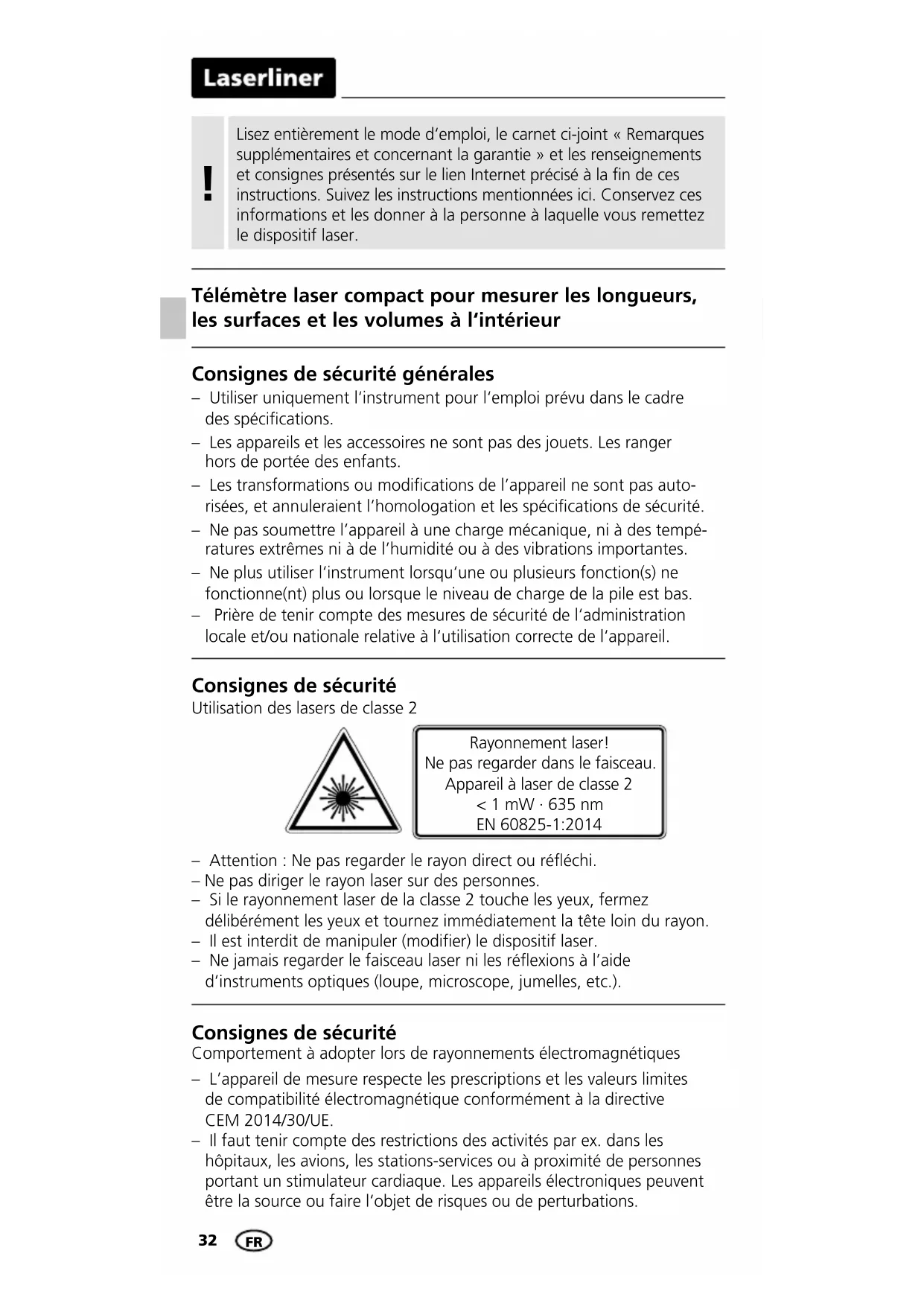 Tekniske data (Ret til ændringer forbeholdt. 17W51) Måleområde indendørs 0,2 m - 70 m Nøjagtighed (typisk)* ± 0,2 mm / m Laserklasse 2 < 1 mW Laserbølgelængde 635 nm Strømforsyning 3 x AAA 1,5 Volt-batterier Mål (B x H x D) 49 x 115 x 26 mm Vægt (inkl. batterier) 145 g Automatisk slukning 30 sek. laser / 3 min. apparat Arbejdsbetingelser -10°C…40°C, Luftfugtighed maks. 20…85% rH, ikke-kondenserende, Arbejdshøjde maks. 2000 m.o.h. Opbevaringsbetingelser -20°C…70°C, Luftfugtighed maks. 80% rH32 Consignes de sécurité Comportement à adopter lors de rayonnements électromagnétiques – L’appareil de mesure respecte les prescriptions et les valeurs limites de compatibilité électromagnétique conformément à la directive CEM 2014/30/UE. – Il faut tenir compte des restrictions des activités par ex. dans les hôpitaux, les avions, les stations-services ou à proximité de personnes portant un stimulateur cardiaque. Les appareils électroniques peuvent être la source ou faire l‘objet de risques ou de perturbations. – Attention : Ne pas regarder le rayon direct ou rééchi. – Ne pas diriger le rayon laser sur des personnes. – Si le rayonnement laser de la classe 2 touche les yeux, fermez délibérément les yeux et tournez immédiatement la tête loin du rayon. – Il est interdit de manipuler (modier) le dispositif laser. – Ne jamais regarder le faisceau laser ni les réexions à l’aide d’instruments optiques (loupe, microscope, jumelles, etc.). Rayonnement laser! Ne pas regarder dans le faisceau. Appareil à laser de classe 2 < 1 mW · 635 nm EN 60825-1:2014 Consignes de sécurité Utilisation des lasers de classe 2 Consignes de sécurité générales – Utiliser uniquement l‘instrument pour l‘emploi prévu dans le cadre des spécications. – Les appareils et les accessoires ne sont pas des jouets. Les ranger hors de portée des enfants. – Les transformations ou modications de l’appareil ne sont pas auto- risées, et annuleraient l’homologation et les spécications de sécurité. – Ne pas soumettre l’appareil à une charge mécanique, ni à des tempé- ratures extrêmes ni à de l’humidité ou à des vibrations importantes. – Ne plus utiliser l‘instrument lorsqu‘une ou plusieurs fonction(s) ne fonctionne(nt) plus ou lorsque le niveau de charge de la pile est bas. – Prière de tenir compte des mesures de sécurité de l‘administration locale et/ou nationale relative à l‘utilisation correcte de l‘appareil. Télémètre laser compact pour mesurer les longueurs, les surfaces et les volumes à l‘intérieur Lisez entièrement le mode d‘emploi, le carnet ci-joint «Remarques supplémentaires et concernant la garantie» et les renseignements et consignes présentés sur le lien Internet précisé à la fin de ces instructions. Suivez les instructions mentionnées ici. Conservez ces informations et les donner à la personne à laquelle vous remettez le dispositif laser.