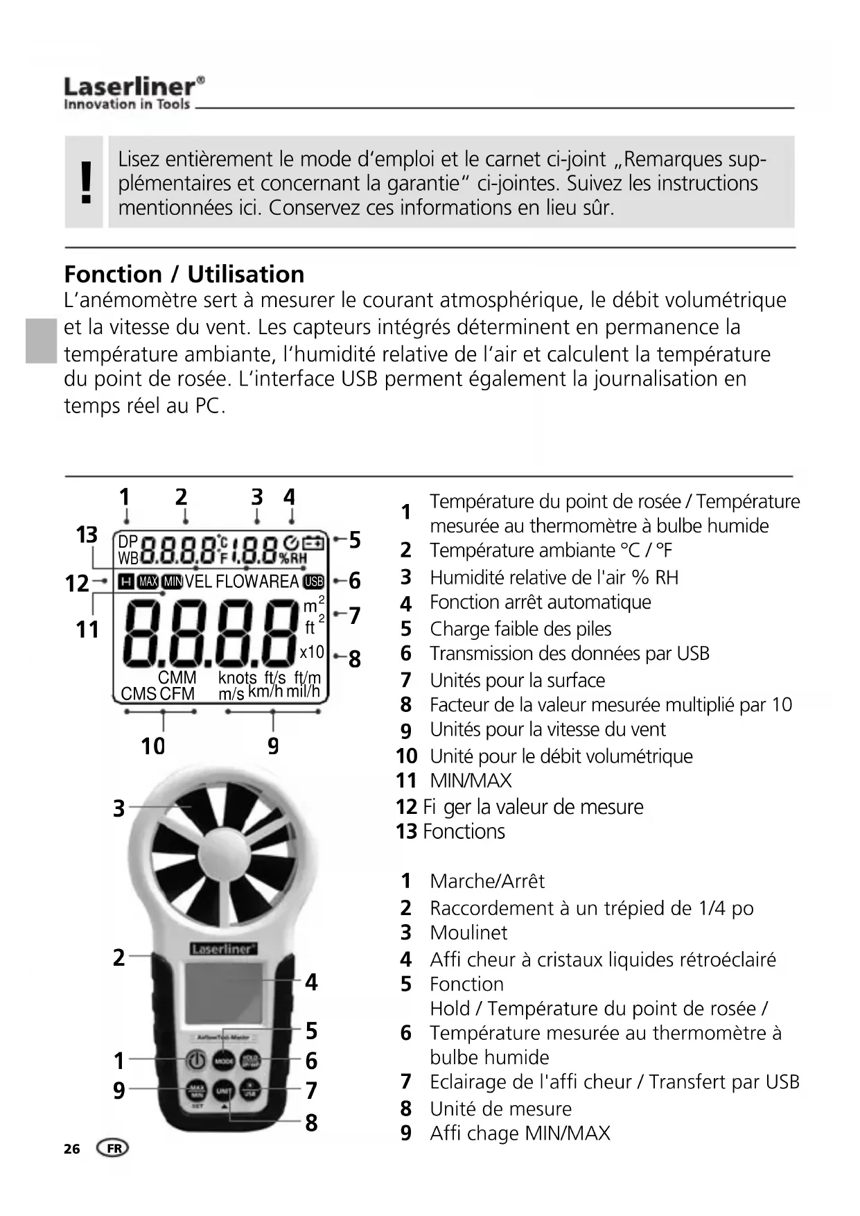 er la valeur de mesure 13 Fonctions Fonction / Utilisation L‘anémomètre sert à mesurer le courant atmosphérique, le débit volumétrique et la vitesse du vent. Les capteurs intégrés déterminent en permanence la température ambiante, l‘humidité relative de l‘air et calculent la température du point de rosée. L‘interface USB perment également la journalisation en temps réel au PC. Lisez entièrement le mode d‘emploi et le carnet ci-joint „Remarques sup- plémentaires et concernant la garantie“ ci-jointes. Suivez les instructions mentionnées ici. Conservez ces informations en lieu sûr.