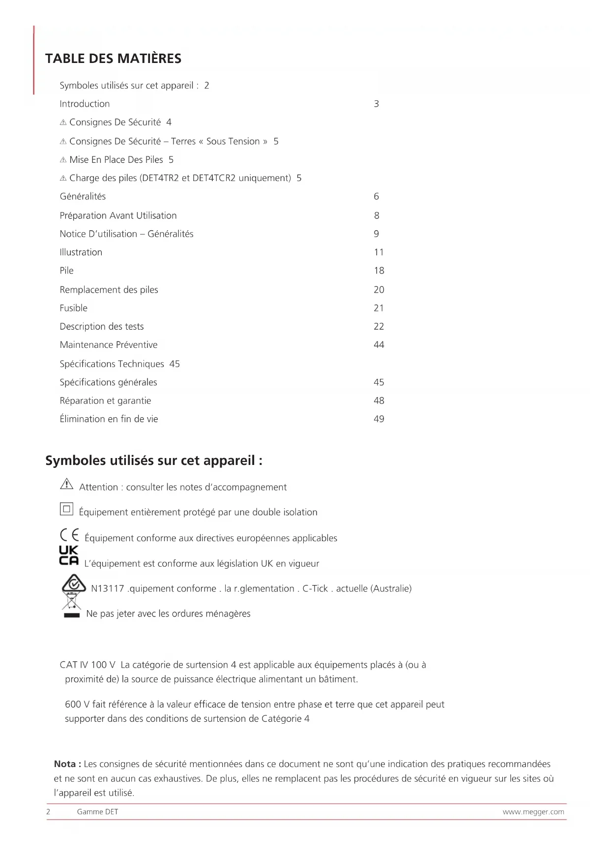 Symboles utilisés sur cet appareil : 2 Introduction 3 G Consignes De Sécurité 4 G Consignes De Sécurité – Terres « Sous Tension » 5 G Mise En Place Des Piles 5 G Charge des piles (DET4TR2 et DET4TCR2 uniquement) 5 Généralités 6 Préparation Avant Utilisation 8 Notice D’utilisation – Généralités 9 Illustration 11 Pile 18 Remplacement des piles 20 Fusible 21 Description des tests 22 Maintenance Préventive 44 Spécifications Techniques 45 Spécifications générales 45 Réparation et garantie 48 Élimination en fin de vie 49www.megger.com Gamme DET