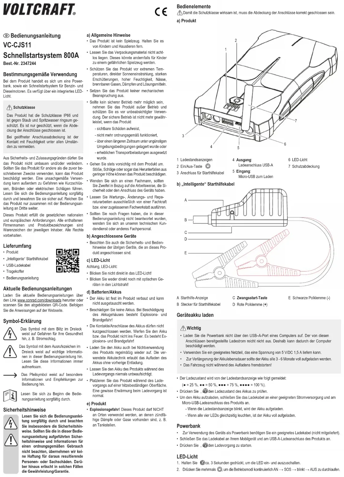 Mode d’emploi VC-CJS11 Système de démarrage rapide 800 A N° de commande 2347244 Utilisation prévue Le produit est une batterie externe et un système de démarrage rapide pour les moteurs à essence et die-sel. Il est doté d’une lampe à LED intégrée. Protection contre les inltrations Le produit a un indice de protection IP66 et est protégé contre la poussière et les projections d’eau de toutes les directions. Il n’est protégé que lorsque le cache des prises est fermé. Le contact avec l’humidité doit être évité en toutes circonstances si le cache des prises est ouvert.Pour des raisons de sécurité et d’homologation, toute restructuration et/ou modication du produit est interdite. Toute utilisation à des ns autres que celles décrites ci-dessus pourrait endommager le produit. De plus, une mauvaise utilisation pourrait entraîner des risques tels que les courts-circuits, les incendies, les chocs électriques, etc. Lisez attentivement les instructions du mode d’emploi et conservez-le dans un endroit sûr. Ne mettez ce produit à la disposition de tiers qu’avec son mode d’emploi.Ce produit est conforme aux exigences nationales et européennes en vigueur. Tous les noms d’entre-prises et appellations de produits sont des marques commerciales de leurs propriétaires respectifs. Tous droits réservés. Contenu de l’emballage
