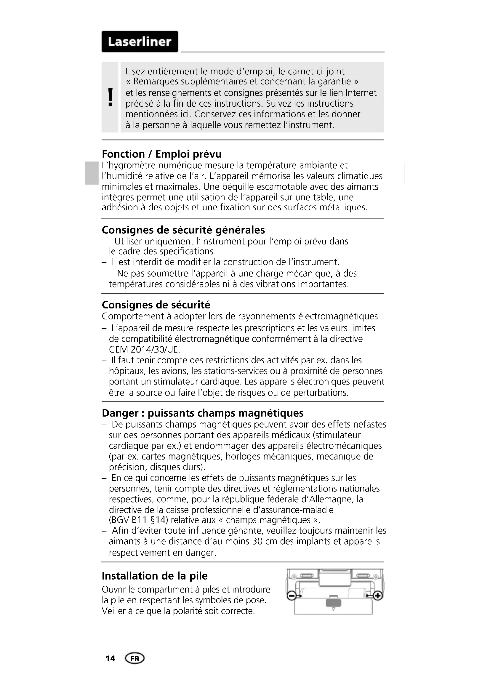 – De puissants champs magnétiques peuvent avoir des effets néfastes sur des personnes portant des appareils médicaux (stimulateur cardiaque par ex.) et endommager des appareils électromécaniques (par ex. cartes magnétiques, horloges mécaniques, mécanique de précision, disques durs). – En ce qui concerne les effets de puissants magnétiques sur les personnes, tenir compte des directives et réglementations nationales respectives, comme, pour la république fédérale d‘Allemagne, la directive de la caisse professionnelle d‘assurance-maladie (BGV B11 §14) relative aux «champs magnétiques». – An d‘éviter toute inuence gênante, veuillez toujours maintenir les aimants à une distance d‘au moins 30cm des implants et appareils respectivement en danger. Installation de la pile Ouvrir le compartiment à piles et introduire la pile en respectant les symboles de pose. Veiller à ce que la polarité soit correcte. Consignes de sécurité Comportement à adopter lors de rayonnements électromagnétiques – L’appareil de mesure respecte les prescriptions et les valeurs limites de compatibilité électromagnétique conformément à la directive CEM 2014/30/UE. – Il faut tenir compte des restrictions des activités par ex. dans les hôpitaux, les avions, les stations-services ou à proximité de personnes portant un stimulateur cardiaque. Les appareils électroniques peuvent être la source ou faire l‘objet de risques ou de perturbations. Consignes de sécurité générales – Utiliser uniquement l‘instrument pour l‘emploi prévu dans le cadre des spécications. – Il est interdit de modier la construction de l‘instrument. – Ne pas soumettre l‘appareil à une charge mécanique, à des températures considérables ni à des vibrations importantes. Lisez entièrement le mode d‘emploi, le carnet ci-joint «Remarques supplémentaires et concernant la garantie» et les renseignements et consignes présentés sur le lien Internet précisé à la fin de ces instructions. Suivez les instructions mentionnées ici. Conservez ces informations et les donner à la personne à laquelle vous remettez l‘instrument.