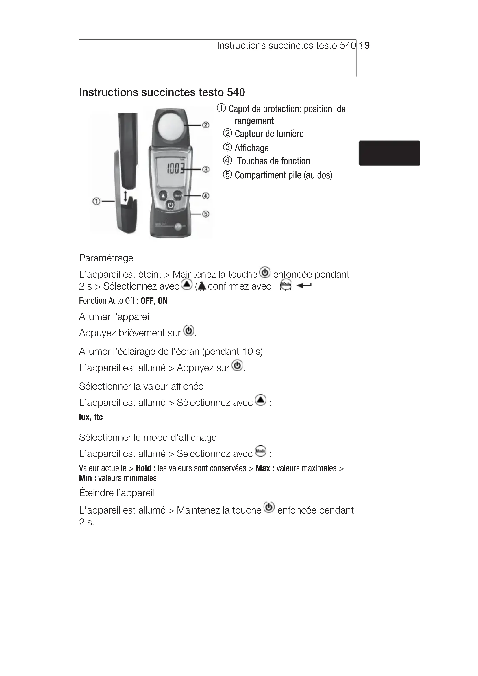 Residual capacity <10 min: Change batteries. If we could not answer your question, please contact your dealer or Testo Customer Service. For contact details, please visit www. testo.com/service-contact. deenfresitptsvnl????Notes18Instructions succinctes testo 540 19 Instructions succinctes testo 540 Capot de protection: position de rangement Capteur de lumière Affichage Touches de fonction Compartiment pile (au dos) Paramétrage L’appareil est éteint > Maintenez la touche enfoncée pendant 2 s > Sélectionnez avec ( ), confirmez avec ( ) : Fonction Auto Off : OFF, ON Allumer l’appareil Appuyez brièvement sur