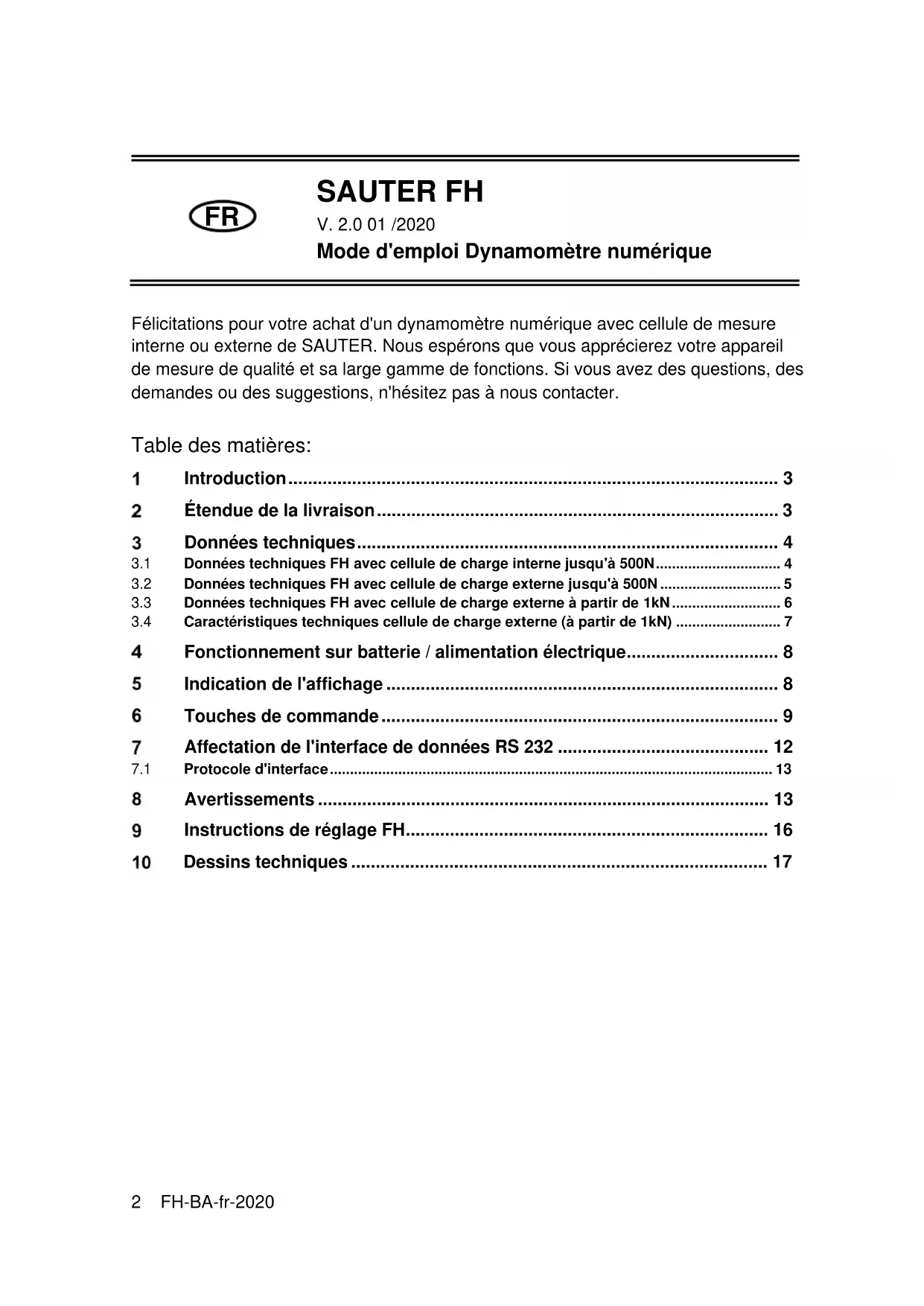 - Félicitations pour votre achat d'un dynamomètre numérique avec cellule de mesure interne ou externe de SAUTER. Nous espérons que vous apprécierez votre appareil de mesure de qualité et sa large gamme de fonctions. Si vous avez des questions, des demandes ou des suggestions, n'hésitez pas à nous contacter. Table des matières: Introduction p. 3