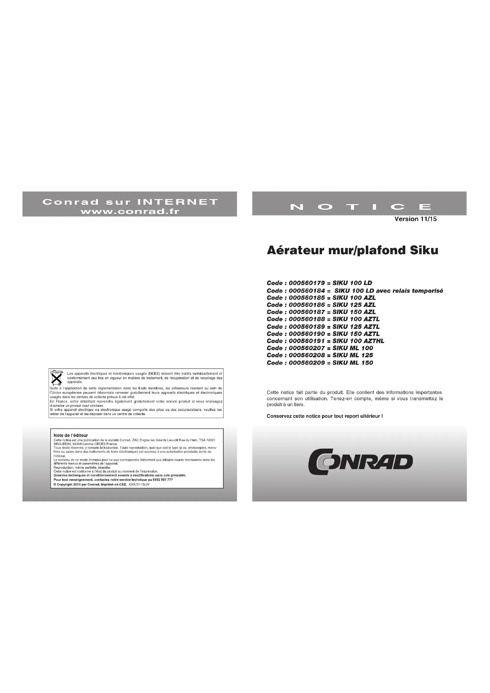 Code:000560179 = SIKU 100 LD Code:000560184 = SIKU 100 LD avec relais temporisé Code:000560185 = SIKU 100 AZL Code:000560186 = SIKU 125 AZL Code:000560187 = SIKU 150 AZL Code:000560188 = SIKU 100 AZTL Code:000560189 = SIKU 125 AZTL Code:000560190 = SIKU 150 AZTL Code:000560191 = SIKU 100 AZTHL Code:000560207 = SIKUML100 Code:000560208 = SIKUML125 Code:000560209 = SIKUML150