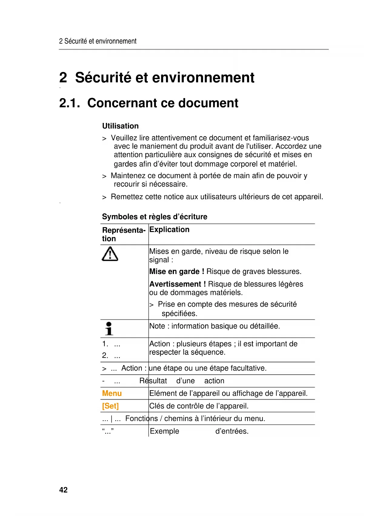 Pos: 2 /TD/Überschr iften/2. Sicher heit und Umwelt @ 0\mod_117377471935 1_79.doc @ 292 @ 1 2 Sécurité et environnement Pos: 3 /TD/Überschri ften/2.1 Zu diesem Dokument @ 0\ mod_1173775252351_79. doc @ 346 @ 2 2.1. Concernant ce document Pos: 4 /TD/Sicherhei t und Umwelt/Zu diesem Doku ment/Verwendung (Standar d) @ 0\mod_11737750685 54_79.doc @ 337 @ 5 Utilisation > Veuillez lire attentivement ce document et familiarisez-vous avec le maniement du produit avant de l'utiliser. Accordez une attention particulière aux consignes de sécurité et mises en gardes afin d’éviter tout dommage corporel et matériel. > Maintenez ce document à portée de main afin de pouvoir y recourir si nécessaire. > Remettez cette notice aux utilisateurs ultérieurs de cet appareil. Pos: 5 /TD/Sicherhei t und Umwelt/Zu diesem Dokumen t/Symbole und Schrei bkonventionen/Symbo le und Schreibkonv. [te sto622/623 @ 4\mod_12493732 25894_79.doc @ 47075 @ 5 Symboles et règles d’écriture Représenta- tion Explication Mises en garde, niveau de risque selon le signal : Mise en garde ! Risque de graves blessures. Avertissement ! Risque de blessures légères ou de dommages matériels. > Prise en compte des mesures de sécurité spécifiées. Note : information basique ou détaillée.