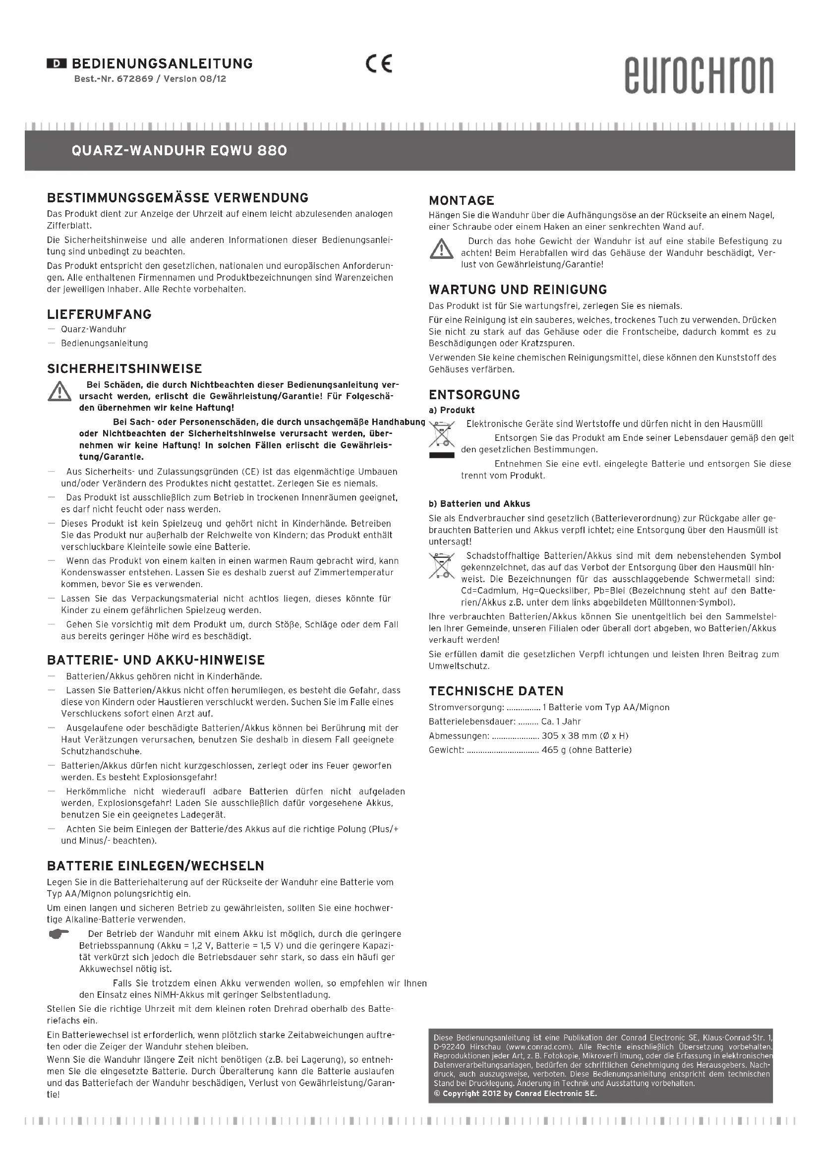 N° de commande 672869 / Version 08/12 UTILISATION CONFORME Le produit sert à affi cher l’heure sur un cadran analogique facile à lire. Il faut impérativement respecter les consignes de sécurité et les autres informations de ce manuel d’utilisation. Cet appareil satisfait aux exigences légales nationales et européennes. Tous les noms d’entreprises et les appellations d’appareils fi gurant dans ce manuel d’uti- lisation sont des marques déposées de leurs propriétaires respectifs. Tous droits réservés.