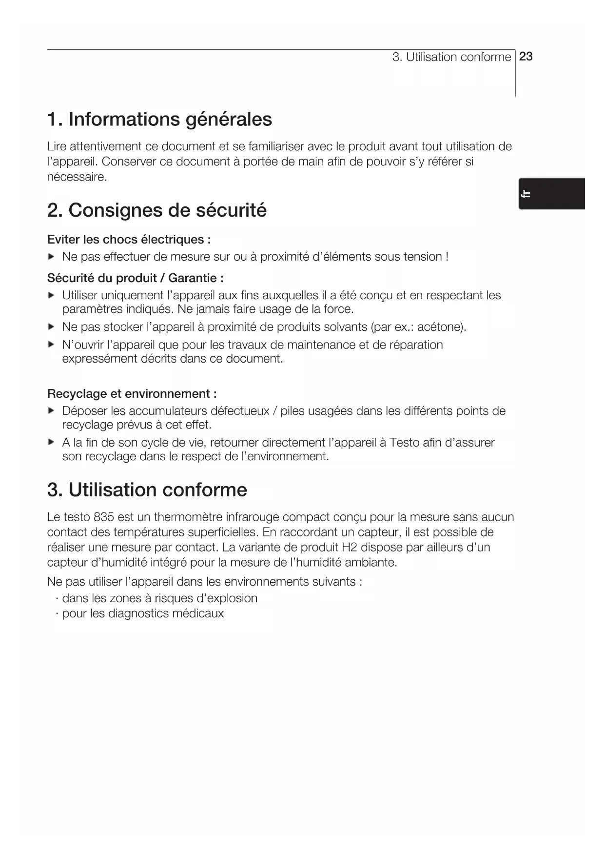 Le testo 835 est un thermomètre infrarouge compact conçu pour la mesure sans aucun contact des températures superficielles. En raccordant un capteur, il est possible de réaliser une mesure par contact. La variante de produit H2 dispose par ailleurs d’un capteur d’humidité intégré pour la mesure de l’humidité ambiante. Ne pas utiliser l’appareil dans les environnements suivants :
