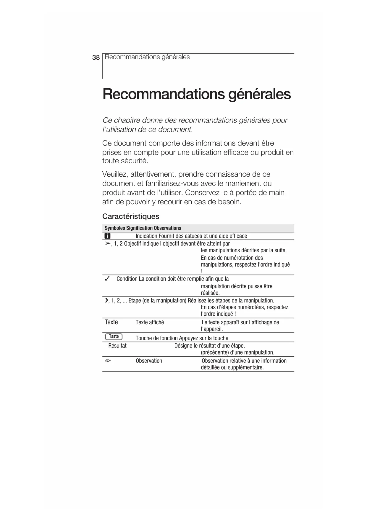 Condition La condition doit être remplie afin que la manipulation décrite puisse être réalisée. i, 1, 2, ... Etape (de la manipulation) Réalisez les étapes de la manipulation. En cas d'étapes numérotées, respectez l'ordre indiqué ! Texte Texte affiché Le texte apparaît sur l'affichage de l'appareil. Touche de fonction Appuyez sur la touche - Résultat Désigne le résultat d'une étape, (précédente) d'une manipulation. º Observation Observation relative à une information détaillée ou supplémentaire. Taste Recommandations générales39