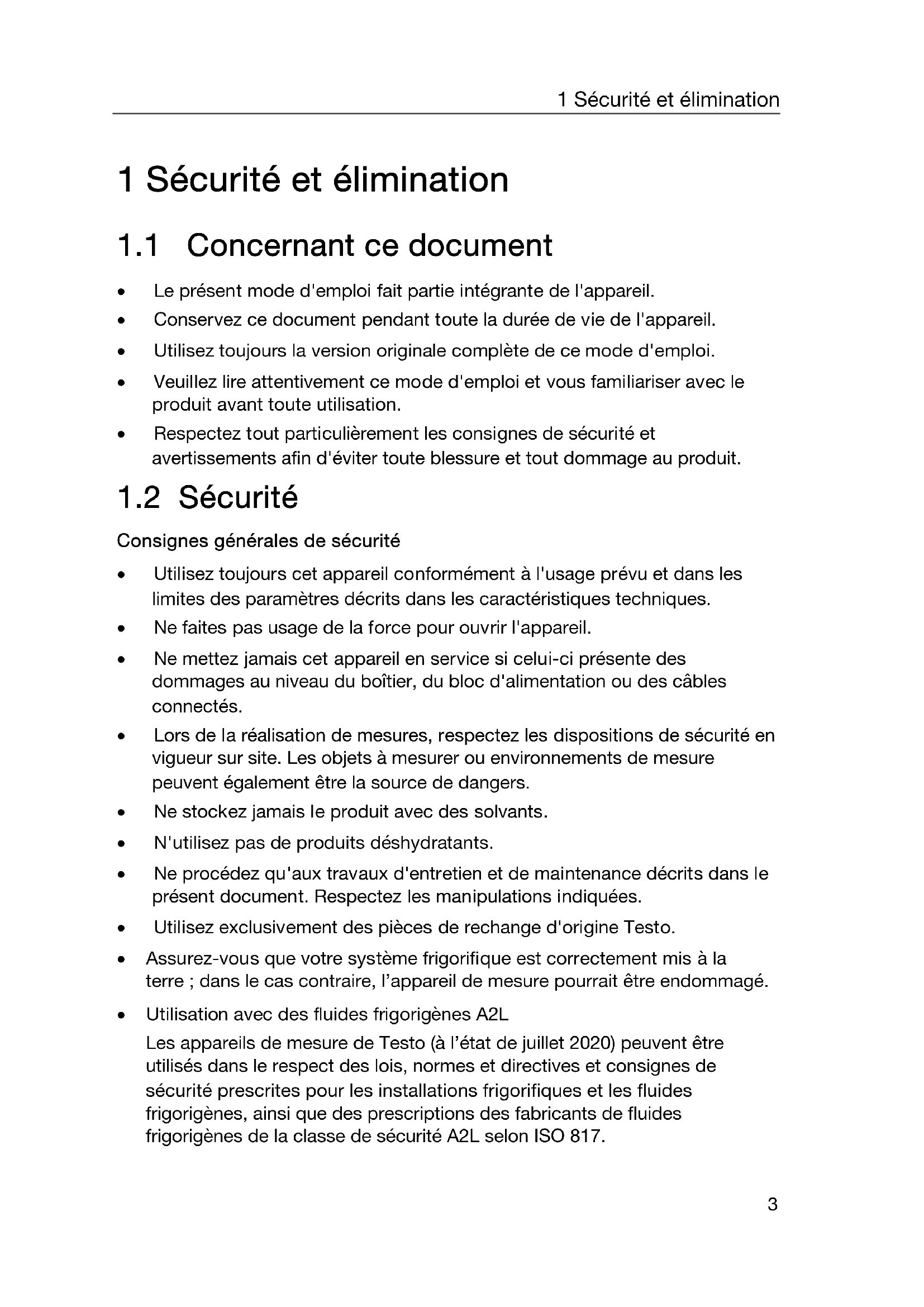 - Utilisation avec des fluides frigorigènes A2L Les appareils de mesure de Testo (à l’état de juillet 2020) peuvent être utilisés dans le respect des lois, normes et directives et consignes de sécurité prescrites pour les installations frigorifiques et les fluides frigorigènes, ainsi que des prescriptions des fabricants de fluides frigorigènes de la classe de sécurité A2L selon ISO 817.1 Sécurité et élimination