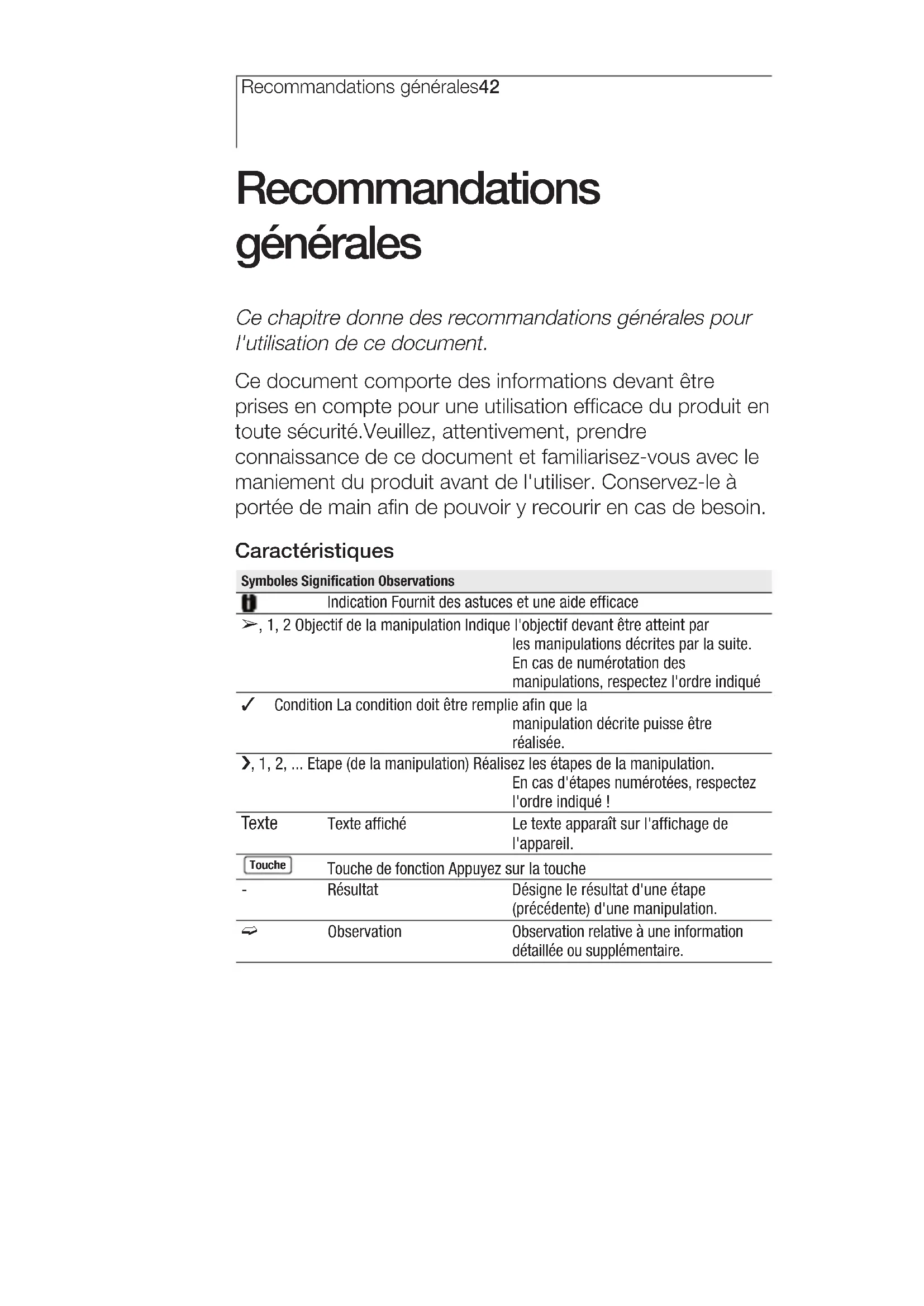 testo 512 Manomètre électroniqueRecommandations générales42 Recommandations générales Ce chapitre donne des recommandations générales pour l'utilisation de ce document. Ce document comporte des informations devant être prises en compte pour une utilisation efficace du produit en toute sécurité.Veuillez, attentivement, prendre connaissance de ce document et familiarisez-vous avec le maniement du produit avant de l'utiliser. Conservez-le à portée de main afin de pouvoir y recourir en cas de besoin. Caractéristiques Symboles Signification Observations Indication Fournit des astuces et une aide efficace ±, 1, 2 Objectif de la manipulation Indique l'objectif devant être atteint par les manipulations décrites par la suite. En cas de numérotation des manipulations, respectez l'ordre indiqué Condition La condition doit être remplie afin que la manipulation décrite puisse être réalisée. i, 1, 2, ... Etape (de la manipulation) Réalisez les étapes de la manipulation. En cas d'étapes numérotées, respectez l'ordre indiqué ! Texte Texte affiché Le texte apparaît sur l'affichage de l'appareil. Touche de fonction Appuyez sur la touche - Résultat Désigne le résultat d'une étape (précédente) d'une manipulation. º Observation Observation relative à une information détaillée ou supplémentaire. Touche1. Consignes de sécurité 43