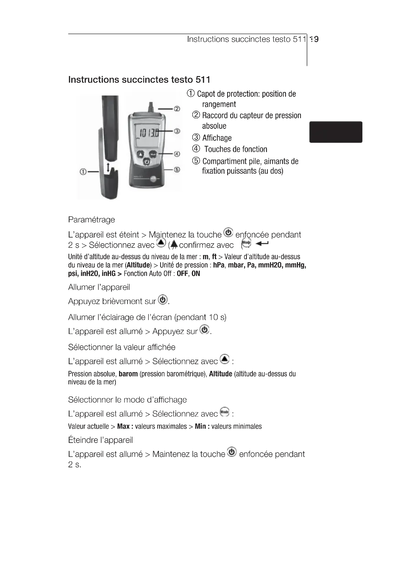 Residual capacity <10 min: Change batteries. If we could not answer your question, please contact your dealer or Testo Customer Service. For contact details, please visit www. testo.com/service-contact Accessories and spare parts Accessories and spare parts can be found in the product catalogues and brochures or in the internet at: www.testo.com deenfresitptsvnl????Notes18Instructions succinctes testo 511 19 Instructions succinctes testo 511 Capot de protection: position de rangement Raccord du capteur de pression absolue Affichage Touches de fonction Compartiment pile, aimants de fixation puissants (au dos) Paramétrage L’appareil est éteint > Maintenez la touche enfoncée pendant 2 s > Sélectionnez avec ( ), confirmez avec ( : Unité d’altitude au-dessus du niveau de la mer : m, ft > Valeur d’altitude au-dessus du niveau de la mer (Altitude) > Unité de pression : hPa, mbar, Pa, mmH2O, mmHg, psi, inH2O, inHG > Fonction Auto Off : OFF, ON Allumer l’appareil Appuyez brièvement sur