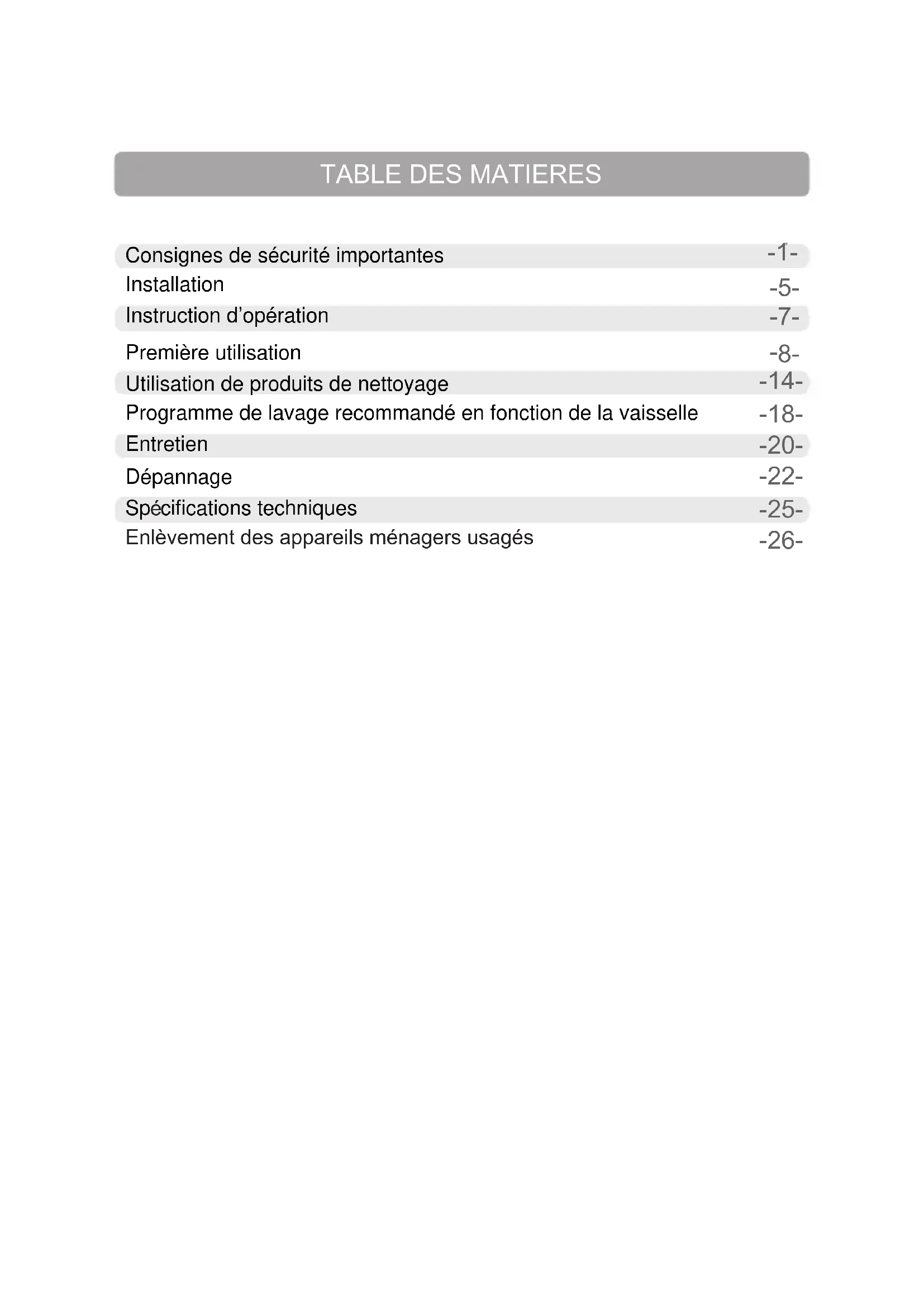 Consignes de sécurité importantes Installation Instruction d’opération Première utilisation Utilisation de produits de nettoyage Programme de lavage recommandé en fonction de la vaisselle Entretien Dépannage Enlèvement des appareils ménagers usagés cifications techniques SpCET APPAREIL EST DESTINE A UN USAGE DOMESTIQUE UNIQUEMENT! Veuillez lire attentivement toutes les instructions avant la première utilisationet conservez-les pour une référenceultérieure.