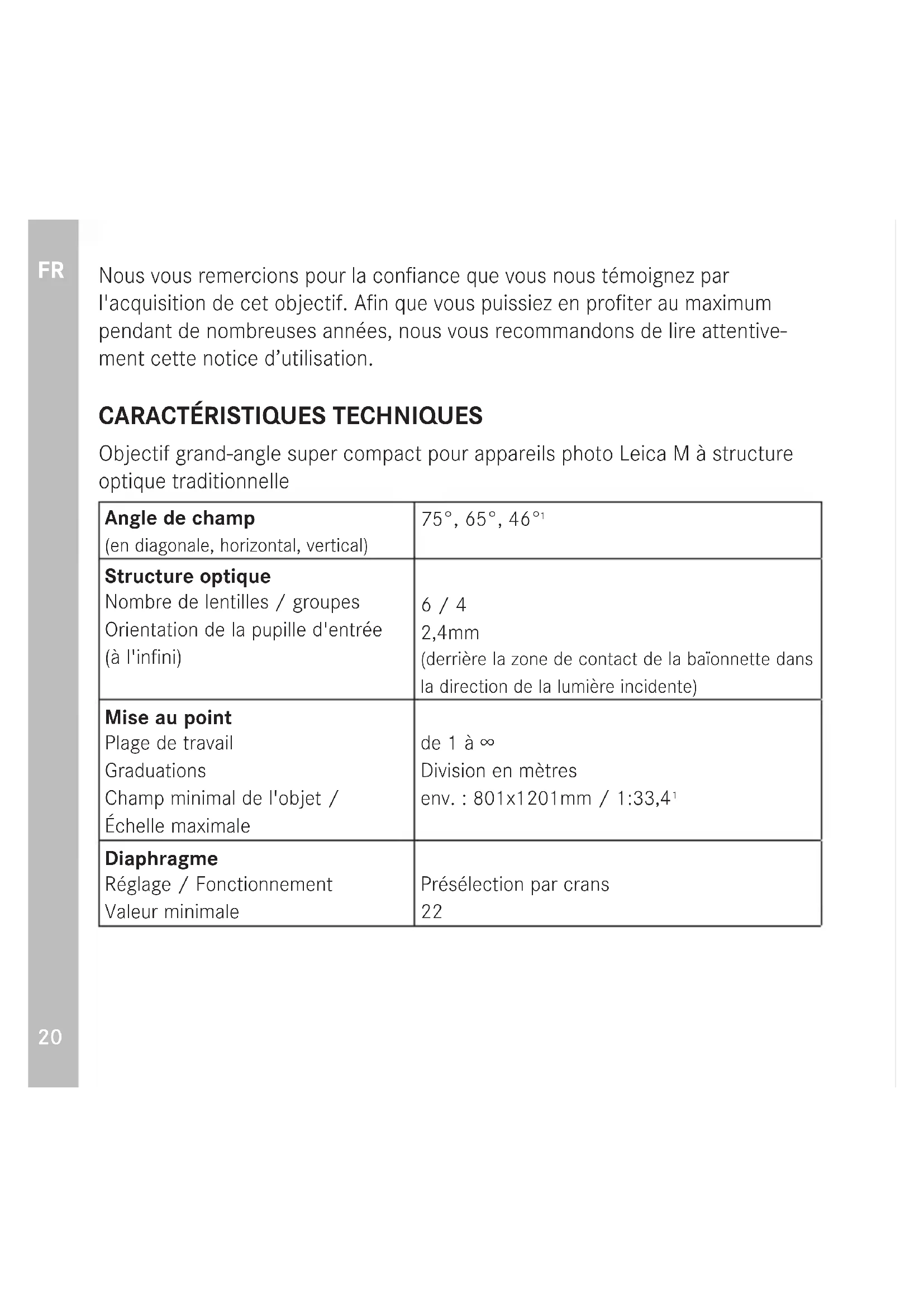 Objectif grand-angle super compact pour appareils photo Leica M à structure optique traditionnelle Angle de champ (en diagonale, horizontal, vertical) 75°, 65°, 46°