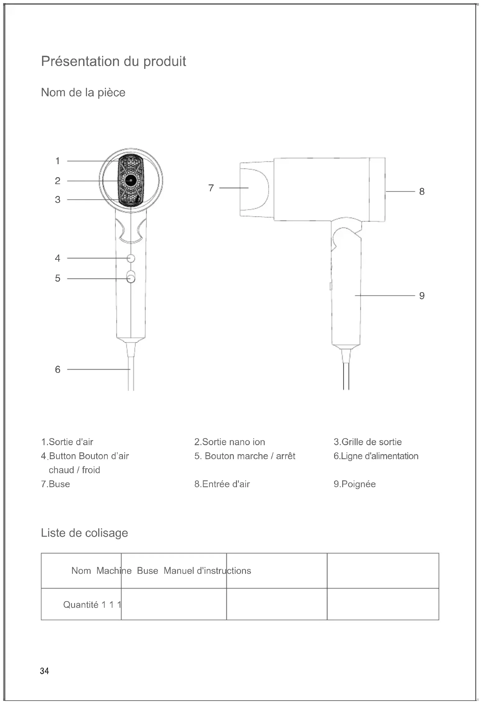 8.Entrée d'air 3.Grille de sortie 6.Ligne d'alimentation 9.Poignée Liste de colisage Nom Machine Buse Manuel d'instructions Quantité 1 1 1