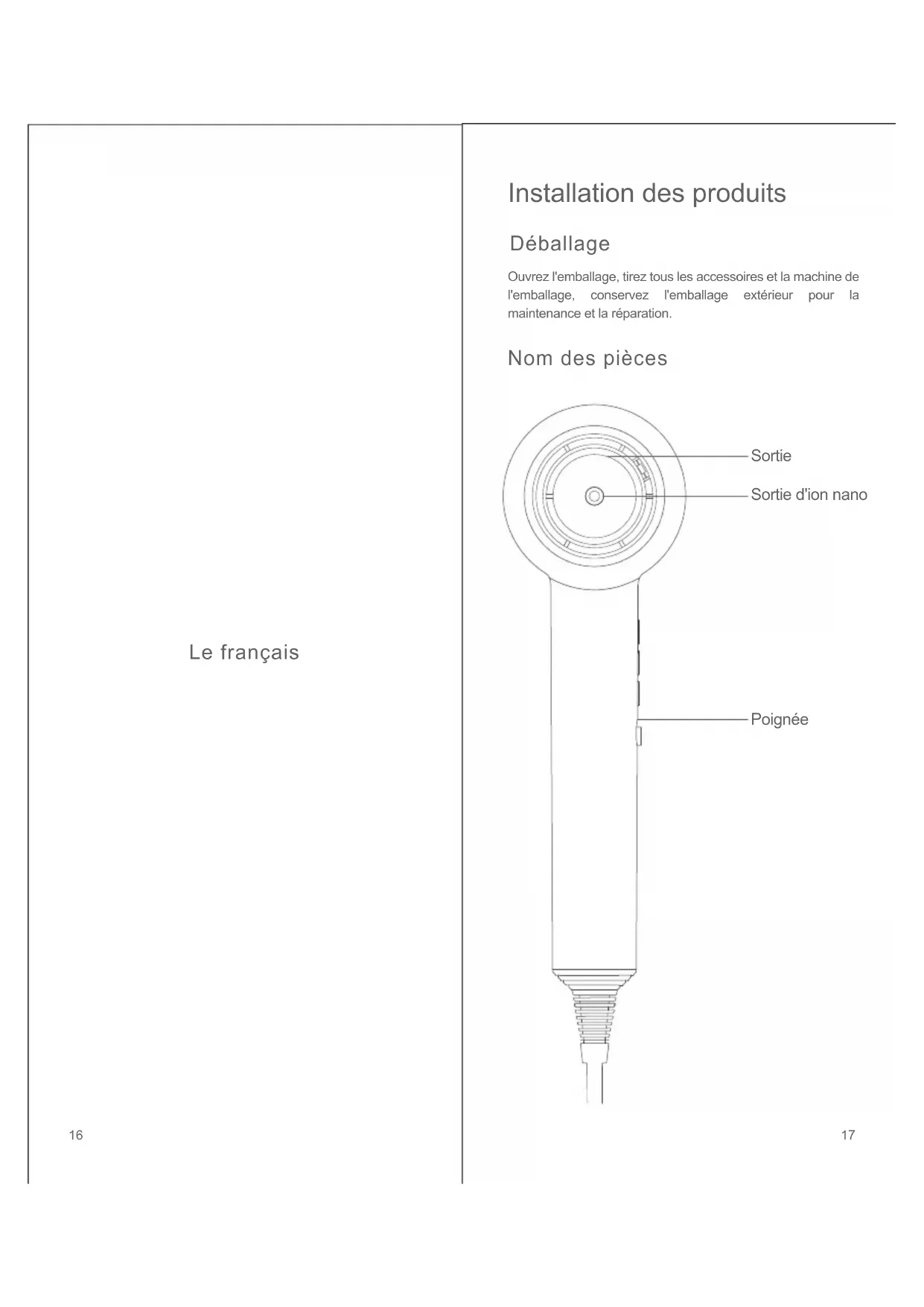 Slide Button Disposal 1514Le français Nom des pièces Ouvrez l'emballage, tirez tous les accessoires et la machine de l'emballage, conservez l'emballage extérieur pour la maintenance et la réparation. Installation des produits Déballage Sortie Sortie d'ion nano Poignée 1716Entrée Vitesse Chaleur Allumé/éteint Ligne d'alimentation