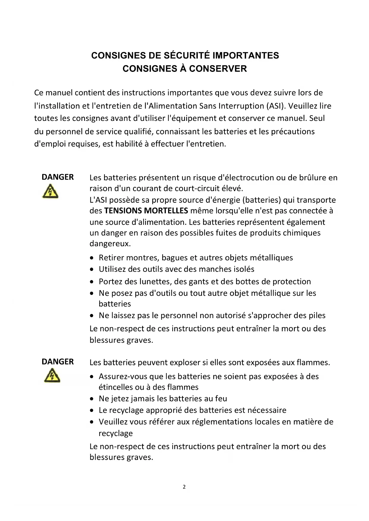 Ce manuel contient des instructions importantes que vous devez suivre lors de l'installation et l'entretien de l'Alimentation Sans Interruption (ASI). Veuillez lire toutes les consignes avant d'utiliser l'équipement et conserver ce manuel. Seul du personnel de service qualifié, connaissant les batteries et les précautions d'emploi requises, est habilité à effectuer l'entretien.