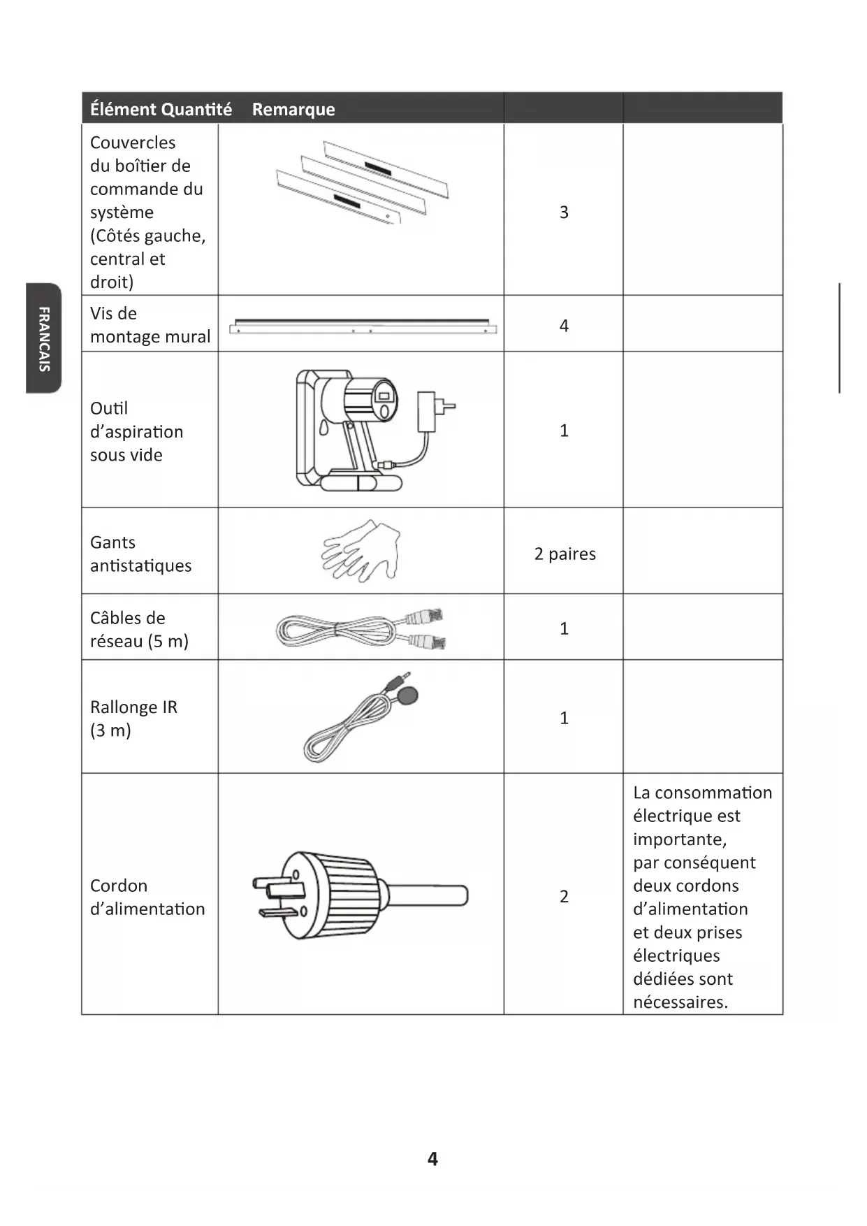 1 x 5 mm 1 x 8 mm4 FRANCAIS Élément Quanté Remarque Couvercles du boîer de commande du système (Côtés gauche, central et droit)