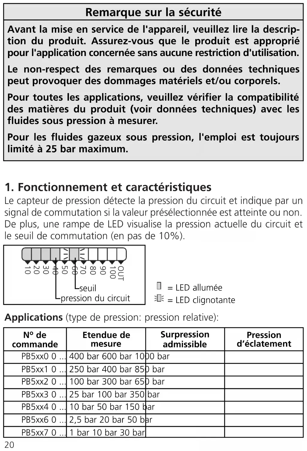 - ,5 bar 20 bar 50 bar PB5xx7 0 bar 10 bar 30 bar Remarque sur la sécurité Avant la mise en service de l'appareil, veuillez lire la descrip- tion du produit. Assurez-vous que le produit est approprié pour l'application concernée sans aucune restriction d'utilisation. Le non-respect des remarques ou des données techniques peut provoquer des dommages matériels et/ou corporels. Pour toutes les applications, veuillez vérifier la compatibilité des matières du produit (voir données techniques) avec les fluides sous pression à mesurer. Pour les fluides gazeux sous pression, l'emploi est toujours limité à 25 bar maximum.Eviter les pics de pression statiques et dynamiques qui dépassent la valeur de surpression indiquée. Même si la pression d'éclatement est dépassée brièvement l'ap- pareil peut être détruit (danger de blessures)! Indication de la pression actuelle du circuit à partir de 5% de la valeur de l'étendue de mesure. “Toutes les LED ETEINTES” ne veut pas dire que le circuit n'est pas sous pression! L'appareil p. 1