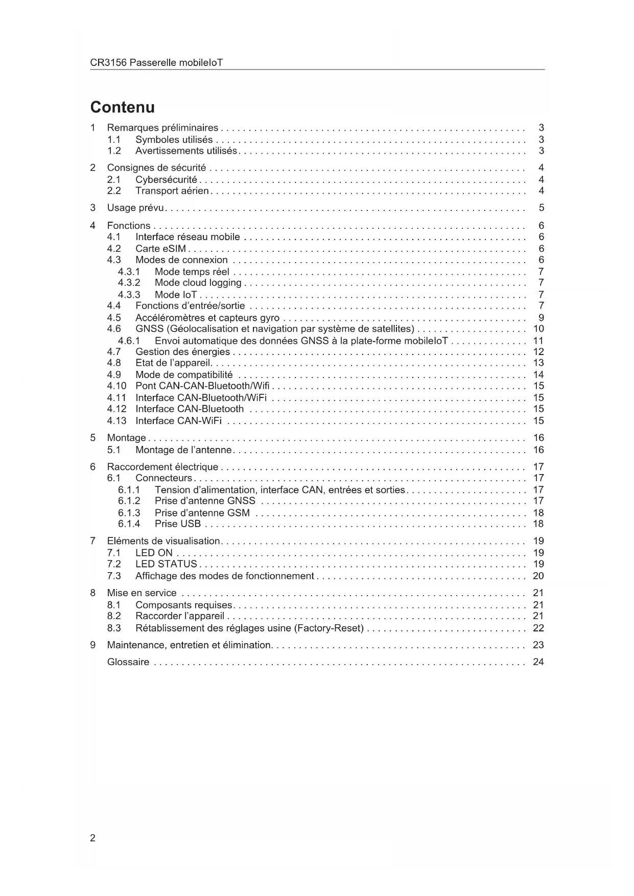 - Remplacer les appareils endommagés, car autrement les données techniques et la sécurité sont affectées. 2.1 Cybersécurité INFORMATION IMPORTANTE Fonctionnement de l’appareil dans un environnement réseau non protégé w Un accès non autorisé en lecture et écriture est possible. w Une utilisation détournée du fonctionnement de l’appareil est possible. u Vérifier et restreindre les possibilités d’accès à l’appareil. 2.2 Transport aérien L’appareil ne doit pas être utilisé à bord d’avions. L’utilisation à bord d’avions peut affecter les systèmes de navigation et de communication. La violation peut entraîner des effets juridiques contre le violateur.Passerelle mobileIoT CR3156