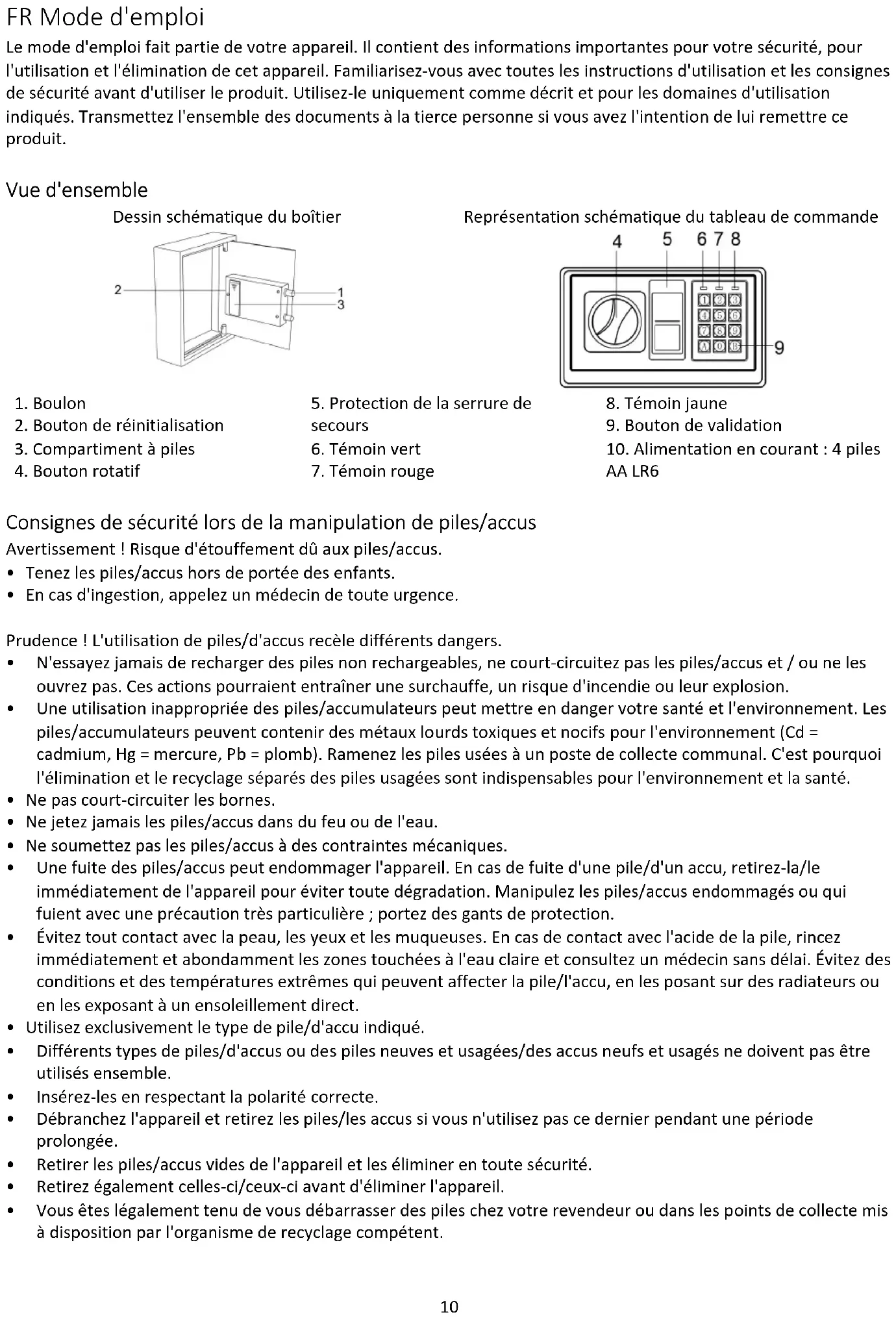 - Vous êtes légalement tenu de vous débarrasser des piles chez votre revendeur ou dans les points de collecte mis à disposition par l'organisme de recyclage compétent.11 Contenu du coffret Vérifiez le contenu de l'emballage du coffre-fort avant d'utiliser ce dernier. Veuillez vous adresser à notre service après-vente si une pièce manque ou est endommagée. 1 Coffre-fort 2 Clés de secours 1 Mode d'emploi Porte-clés