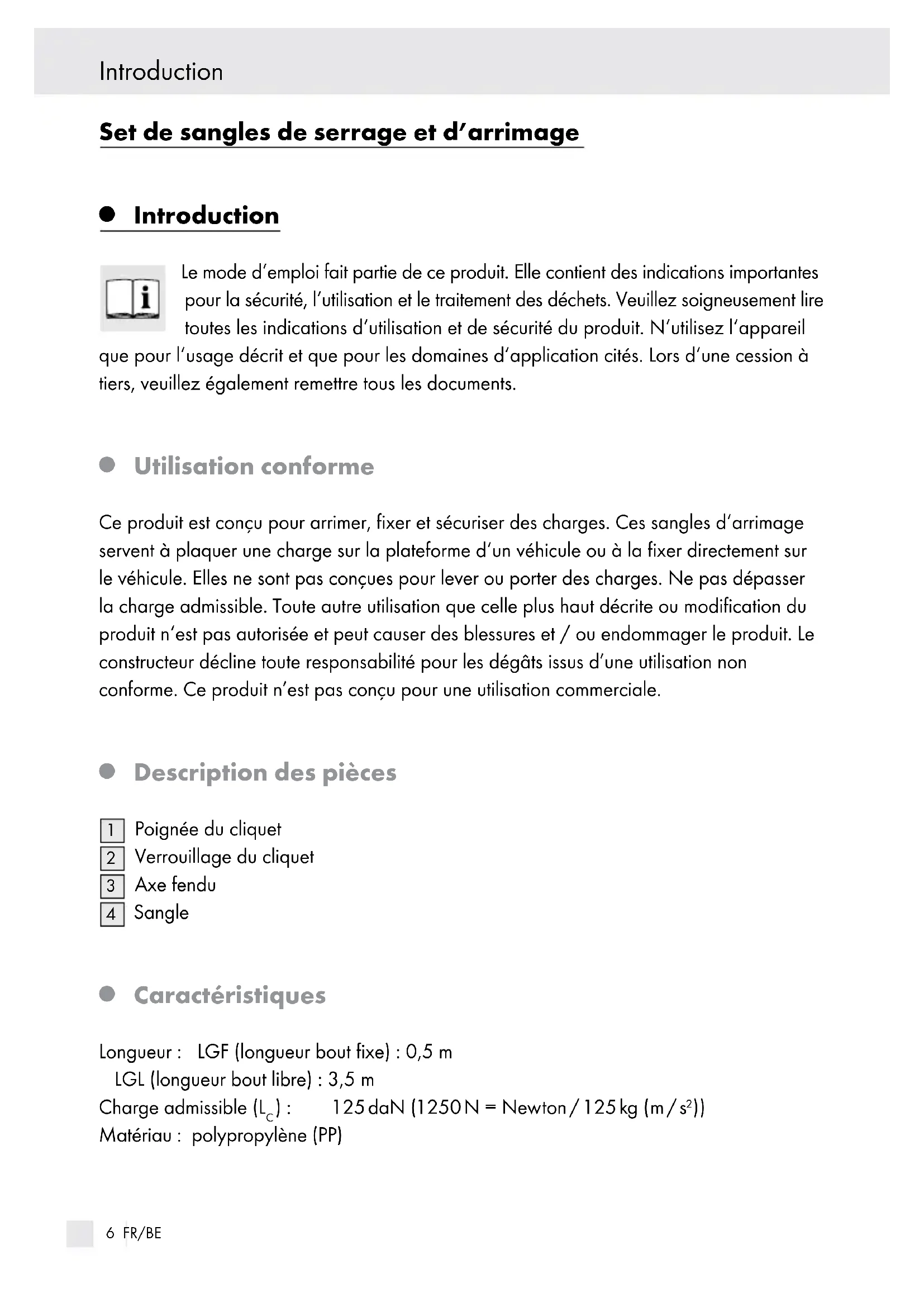 Utilisation conforme Ce produit est conçu pour arrimer, fixer et sécuriser des charges. Ces sangles d‘arrimage servent à plaquer une charge sur la plateforme d‘un véhicule ou à la fixer directement sur le véhicule. Elles ne sont pas conçues pour lever ou porter des charges. Ne pas dépasser la charge admissible. Toute autre utilisation que celle plus haut décrite ou modification du produit n‘est pas autorisée et peut causer des blessures et / ou endommager le produit. Le constructeur décline toute responsabilité pour les dégâts issus d’une utilisation non conforme. Ce produit n’est pas conçu pour une utilisation commerciale.