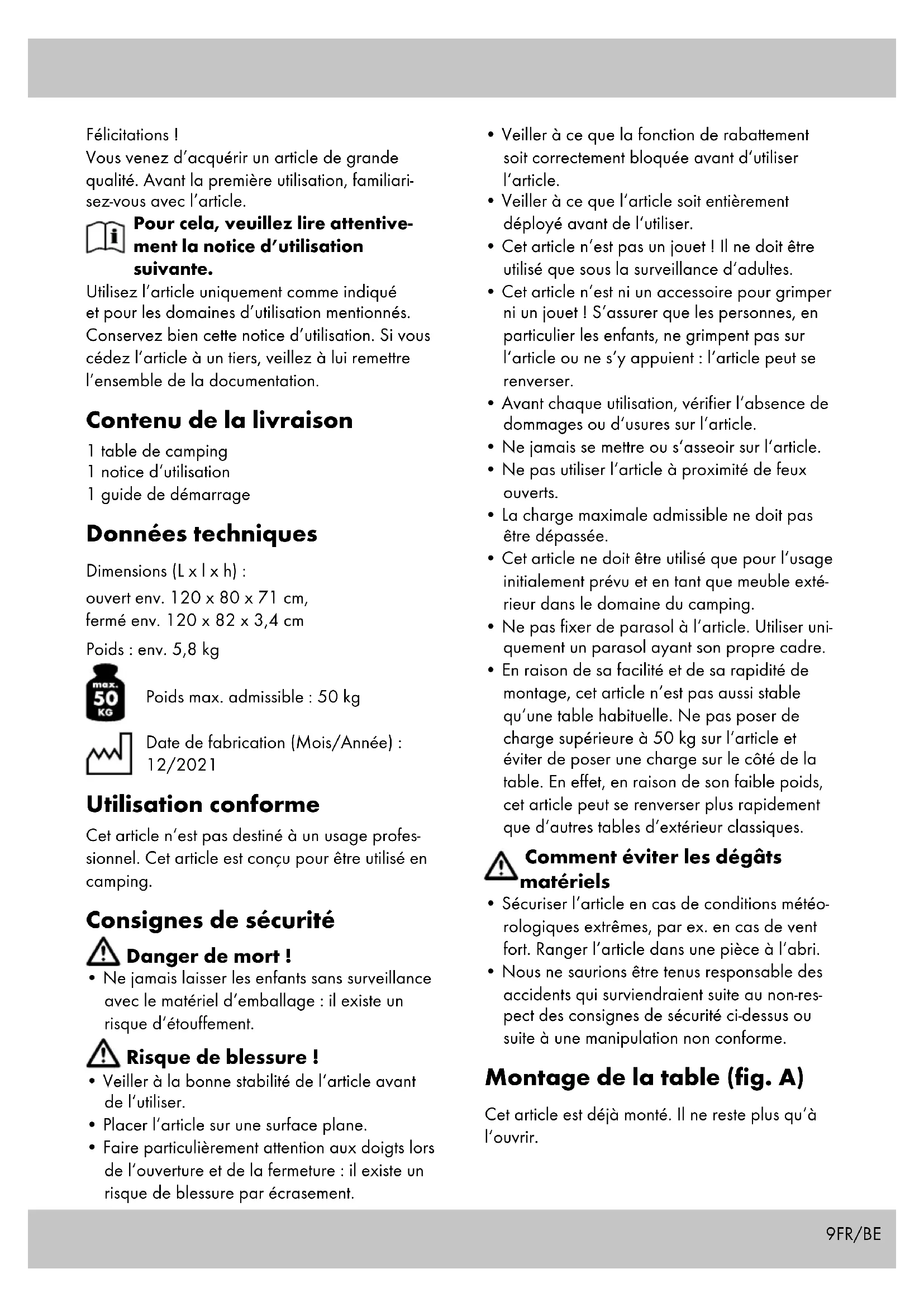 - s‘il présente les qualités qu‘un acheteur peut légitimement attendre eu égard aux déclara- tions publiques faites par le vendeur, par le producteur ou par son représentant, notam- ment dans la publicité ou l‘étiquetage ; 2° Ou s‘il présente les caractéristiques définies d‘un commun accord par les parties ou être propre à tout usage spécial recherché par l‘acheteur, porté à la connaissance du vendeur et que ce dernier a accepté. par l‘acheteur, porté à la connaissance du vendeur et que ce dernier a accepté. Article L217-12 du Code de la consommation L‘action résultant du défaut de conformité se prescrit par deux ans à compter de la délivrance du bien. Article 1641 du Code civil Le vendeur est tenu de la garantie à raison des défauts cachés de la chose vendue qui la rendent impropre à l‘usage auquel on la destine, ou qui diminuent tellement cet usage que l‘acheteur ne l‘aurait pas acquise, ou n‘en aurait donné qu‘un moindre prix, s‘il les avait connus. Article 1648 1er alinéa du Code civil L‘action résultant des vices rédhibitoires doit être intentée par l‘acquéreur dans un délai de deux ans à compter de la découverte du vice. Les pièces détachées indispensables à l’utili- sation du produit sont disponibles pendant la durée de la garantie du produit. IAN : 401165_2107 Service France Tel. : 0800 919270 E-Mail : deltasport@lidl.fr Service Belgique Tel. : 070 270 171 (0,15 EUR/Min.) E-Mail : deltasport@lidl.be12 Gefeliciteerd! Met uw aankoop hebt u voor een hoogwaardig artikel gekozen. Zorg ervoor dat u voor het eerste gebruik met het artikel vertrouwd raakt. Lees hiervoor de volgende gebruiksaanwijzing zorgvuldig door. Gebruik het artikel alleen zoals omschreven en voor het aangegeven doel. Bewaar deze geb- ruiksaanwijzing goed. Geef alle documenten mee als u het artikel aan iemand anders geeft. In het leveringspakket inbegrepen 1 x campingtafel 1 x gebruiksaanwijzing 1 x korte handleiding Technische gegevens Afmetingen (l x b x h): opengeklapt ca. 120 x 80 x 71 cm, opgevouwen ca. 120 x 82 x 3,4 cm Gewicht: ca. 5,8 kg Max. belastbaarheid: 50 kg Productiedatum (maand/jaar): 12/2021 Voorgeschreven gebruik Het artikel is niet bestemd voor commercieel ge- bruik. Het artikel is ontworpen voor het gebruik op campings. Veiligheidsinstructies Levensgevaar!